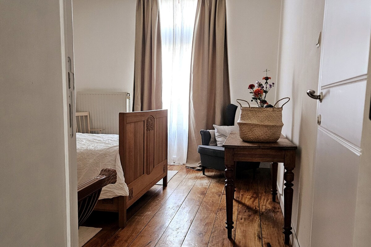 A simple but complete and clean bedroom with all the amenities for your comfort: a comfortable Jugendstil bed and two nice chairs ensure that you can sleep and read, write or just relax at your leisure. You have private sanitary facilities with access to the toilet, shower, washing machine and dryer. There is the possibility to make tea and coffee in the room.