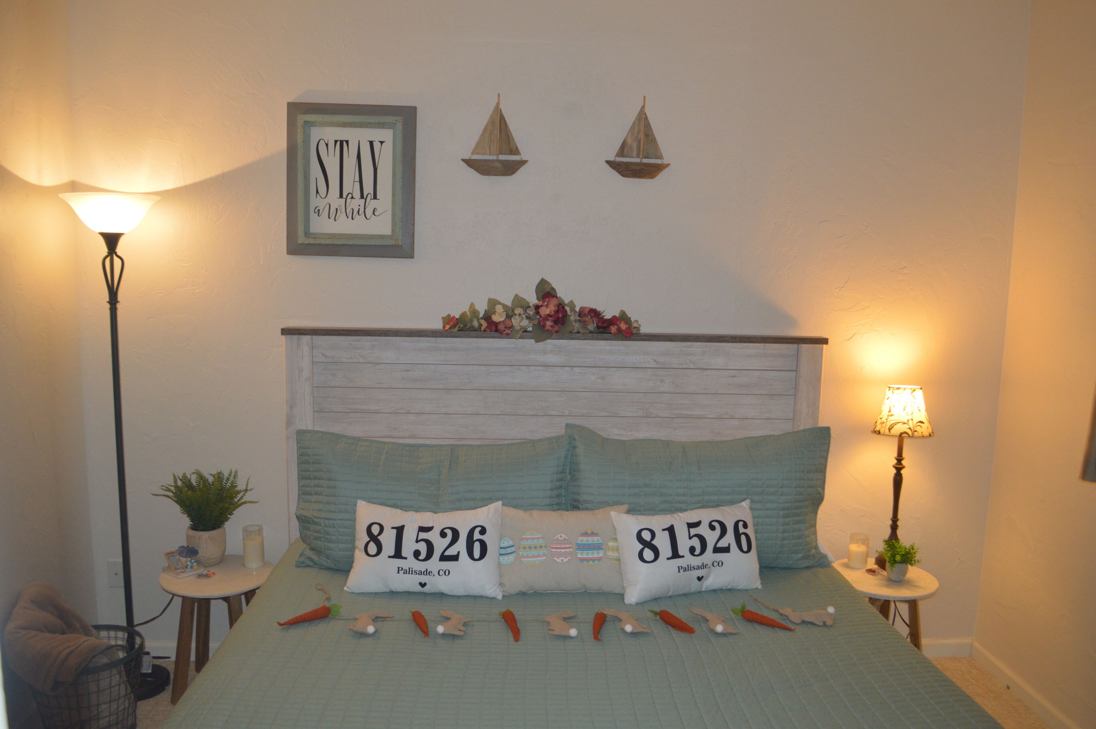 BEDROOM: Need a good night sleep after a long day enjoying everything Palisade has to offer? This King bed with Tuft & Needle Mattress will help. Thoughtful details like charging pads for electronics and comfortable bedding including.