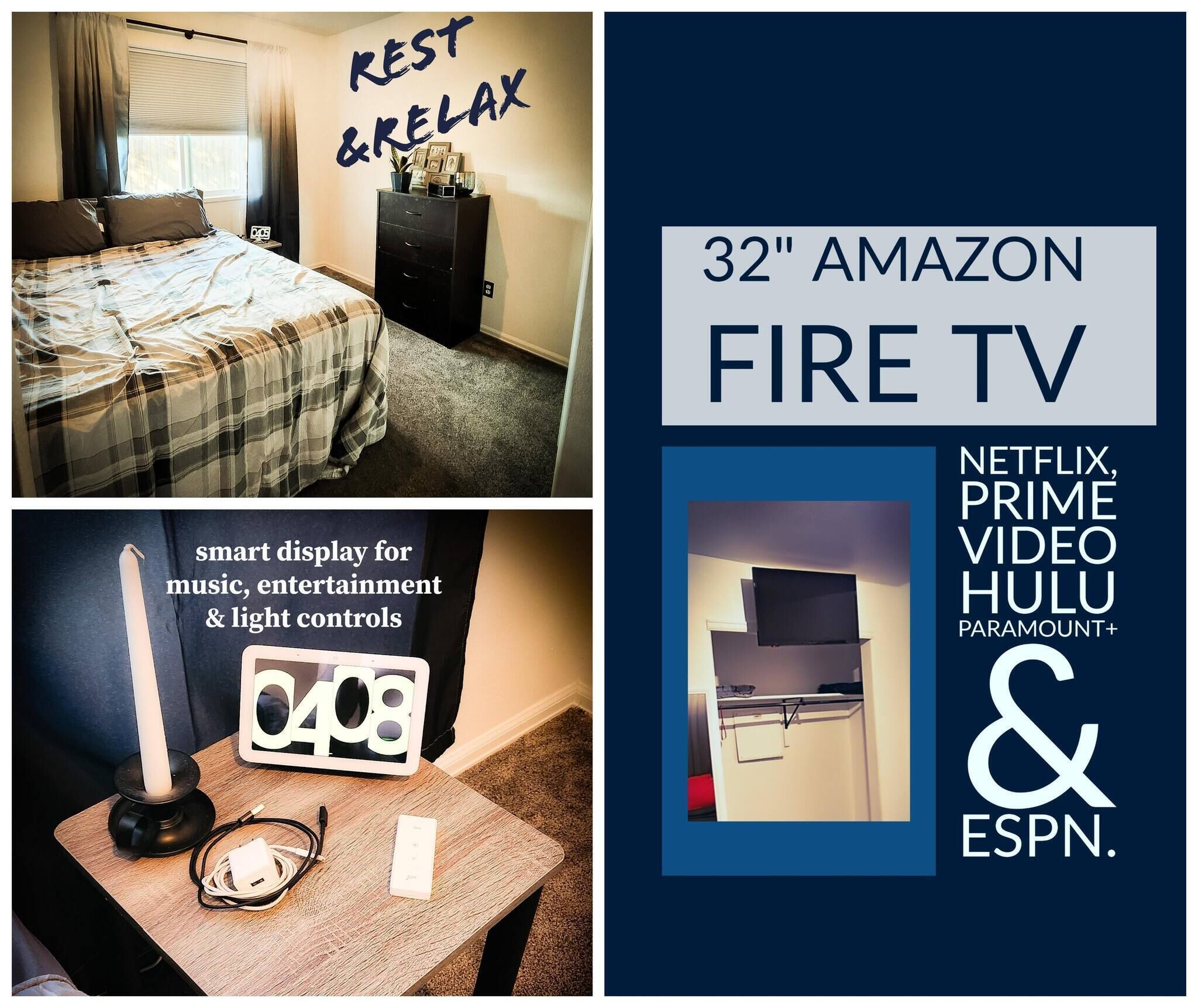 Everything is on the ground level, 1 Queen bed, 1 Queen hide a bed in living room couch, smart TV, WiFi.