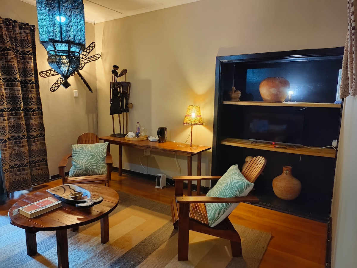 African themed guestlodge looking out on a lush garden, consisting of 7 seperate private apartments. Each with ensuite bathroom, private lounge and patio.