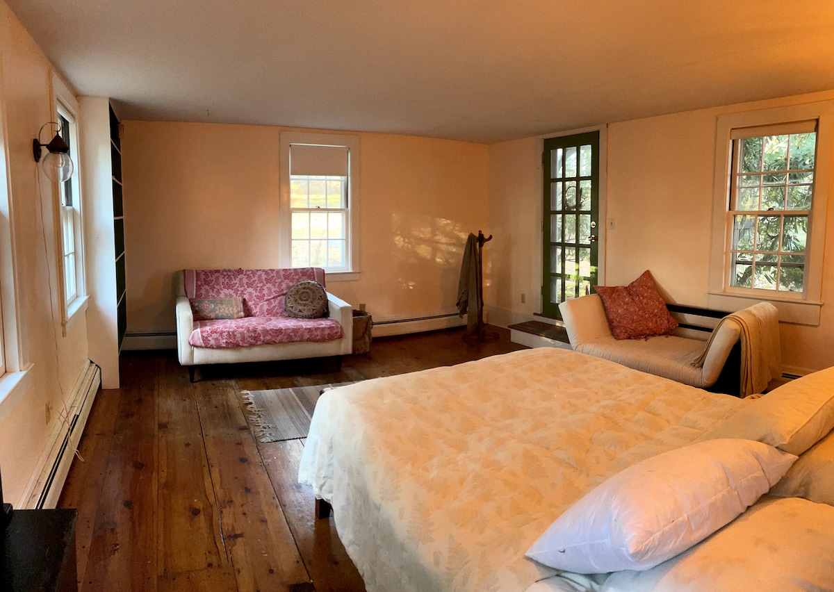 This unique Guesthouse maintains the original rustic barn-like feel with exposed beams, pine boards, and large open spaces. Sweeping pastoral views to the west provide the best sunsets in the Berkshires.