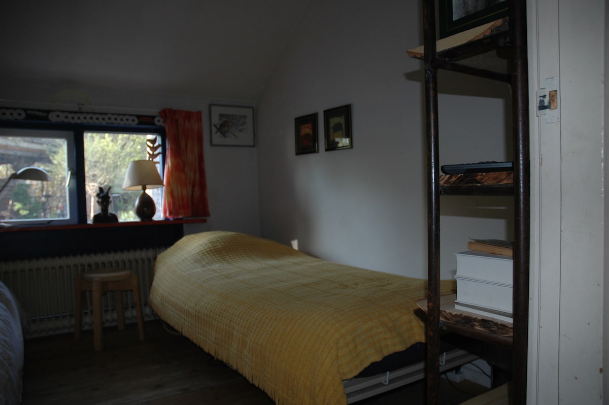 The attic room I offer has a good 2p bed (a box spring of 1.40) and its own large roof terrace from where you can see the A-tower, Martini tower and the trees of the garden. The simple bathroom with shower and toilet will be shared with me when I get there.