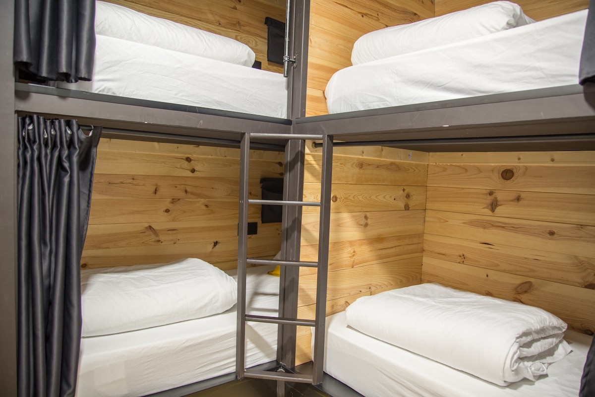 Mixed dormitory room, with 6 beds distributed in 3 cabin bunk beds. Sheets, pillow, duvet and cushion included. Each guest has in his space, a pocket for personal belongings, plug and reading light. The room is equipped with hangers, mirrors, sofas, litter bins and lockers for luggage. The bathroom is located inside the room and is equipped with a gel and shampoo dispenser, toilet paper, mirror, sink, toilet and shower tray.