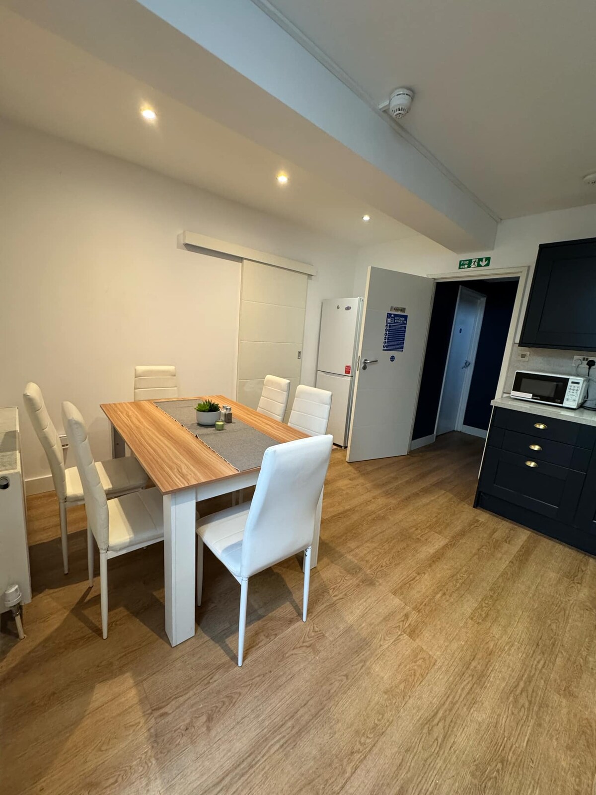 Has separate entrance and has parking at the accommodation. Restaurants, high street shops, pubs and Tesco shop (open from 6.00 am to 12.00 am) within 2 mins walk.
