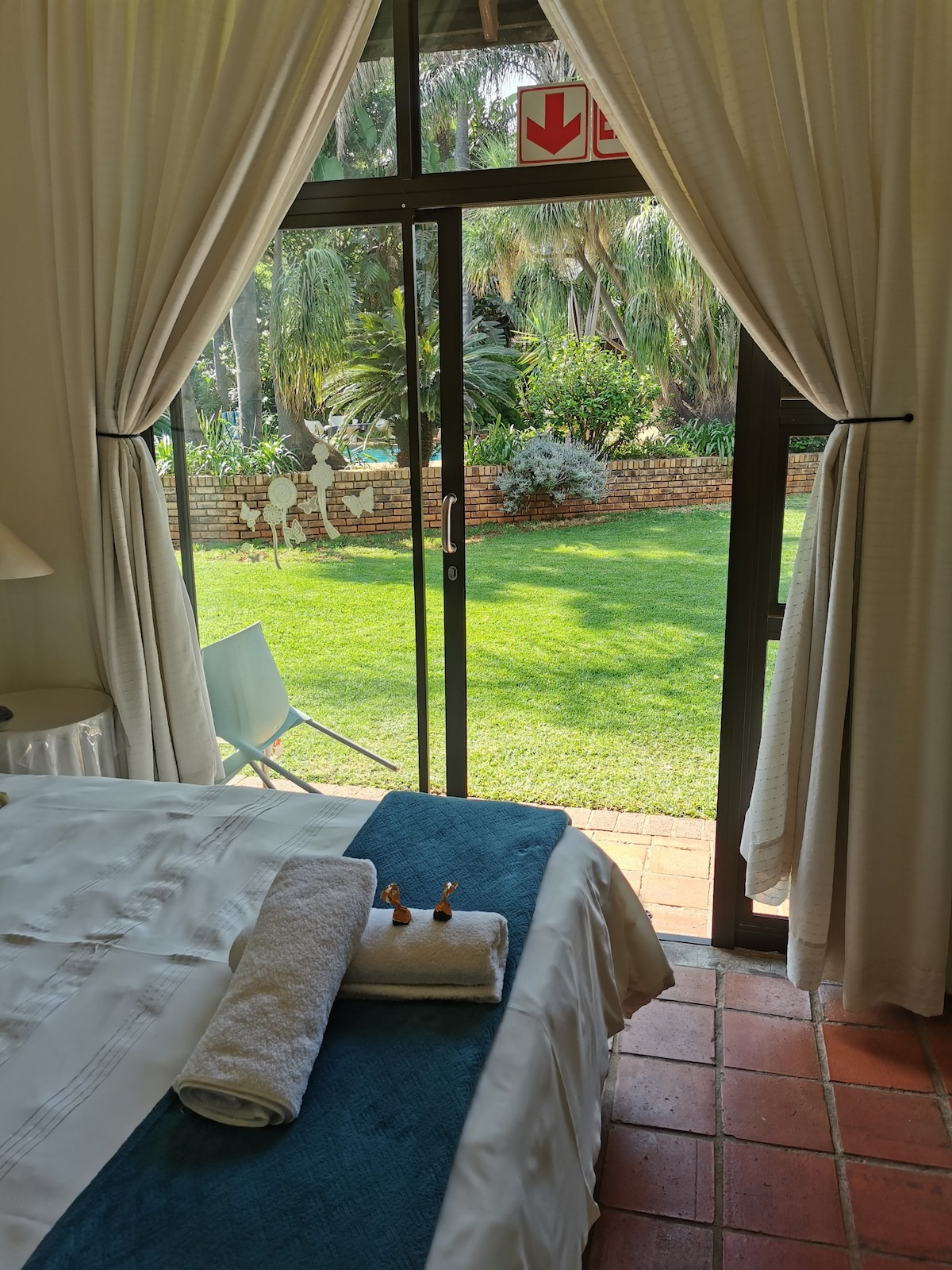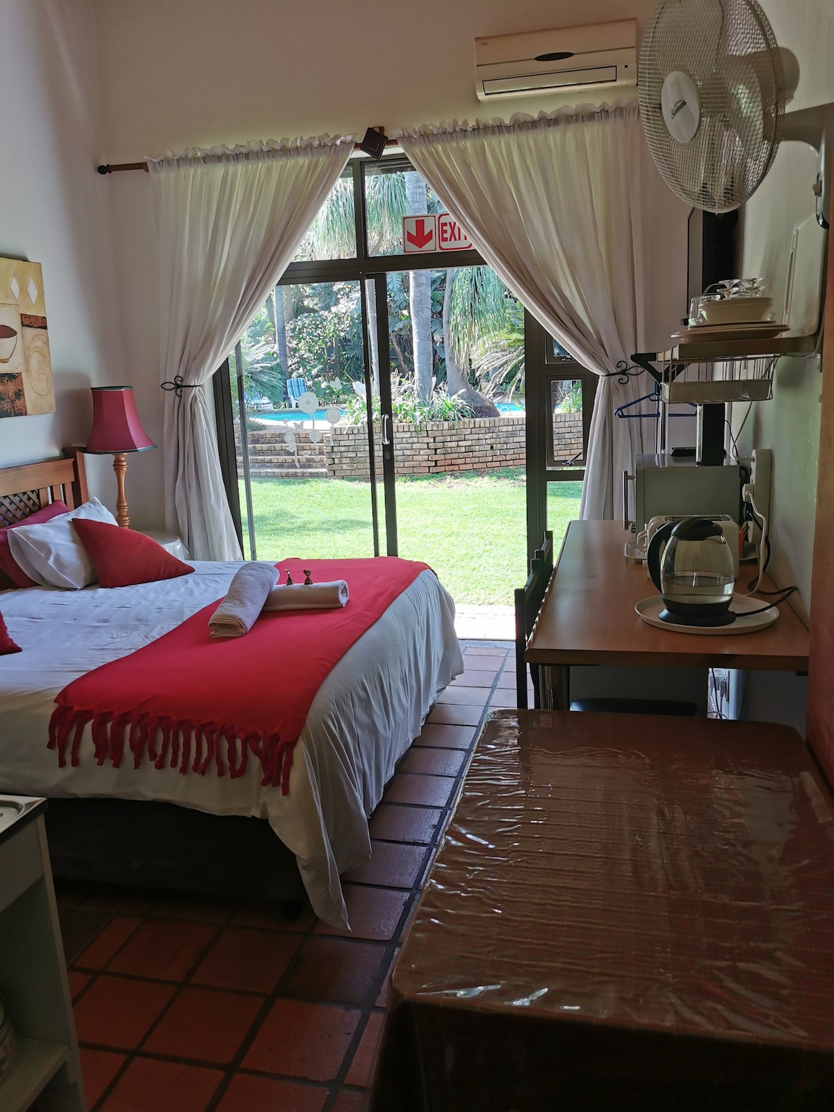 This superior Twin Room with an en-suite bath and shower (separate) is situated on the ground level. It has a balcony and garden view. The room has a flat-screen TV, DStv, desk, seating area, WiFi & Internet access, and a small refrigerator