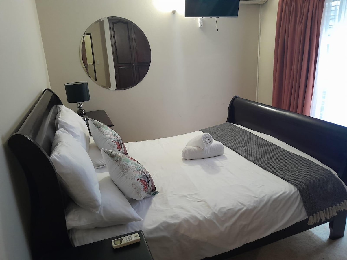 The room have a queen size bed, tv, air-conditioner, small kitchenette and bathroom. Bathroom have a shower. We put scones, muffins, butter, jam, grated cheese, fruit juices, coffee, tea and rusks in the fridge.