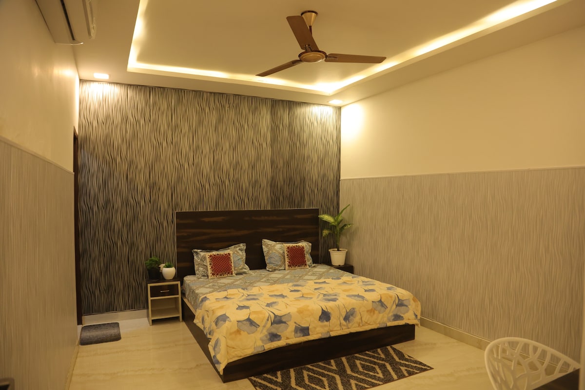 300 sq feet Artistically designed modern bedroom with a luxurious feel & garden view, fall ceiling with lighting effect adds to the warm feel. Spacious king size bed with leather cushion backrest. Equipped with all amenities, T.V, music, book collection, Tea & coffee maker, air-conditioned, free Wifi, attached modern bathroom and wardrobe. The Room is on the Ground Floor and has got separate Private Entry.