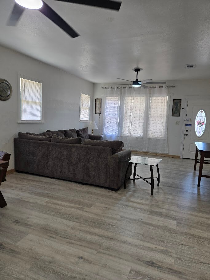 Living room, dinning table for two, laundry (detergent not provided) and kitchen available for your use (fully equipped: pots, dishes, silverware, coffee maker, toaster, microwave, oven, blender, bowls, containers, can opener, towels and more).