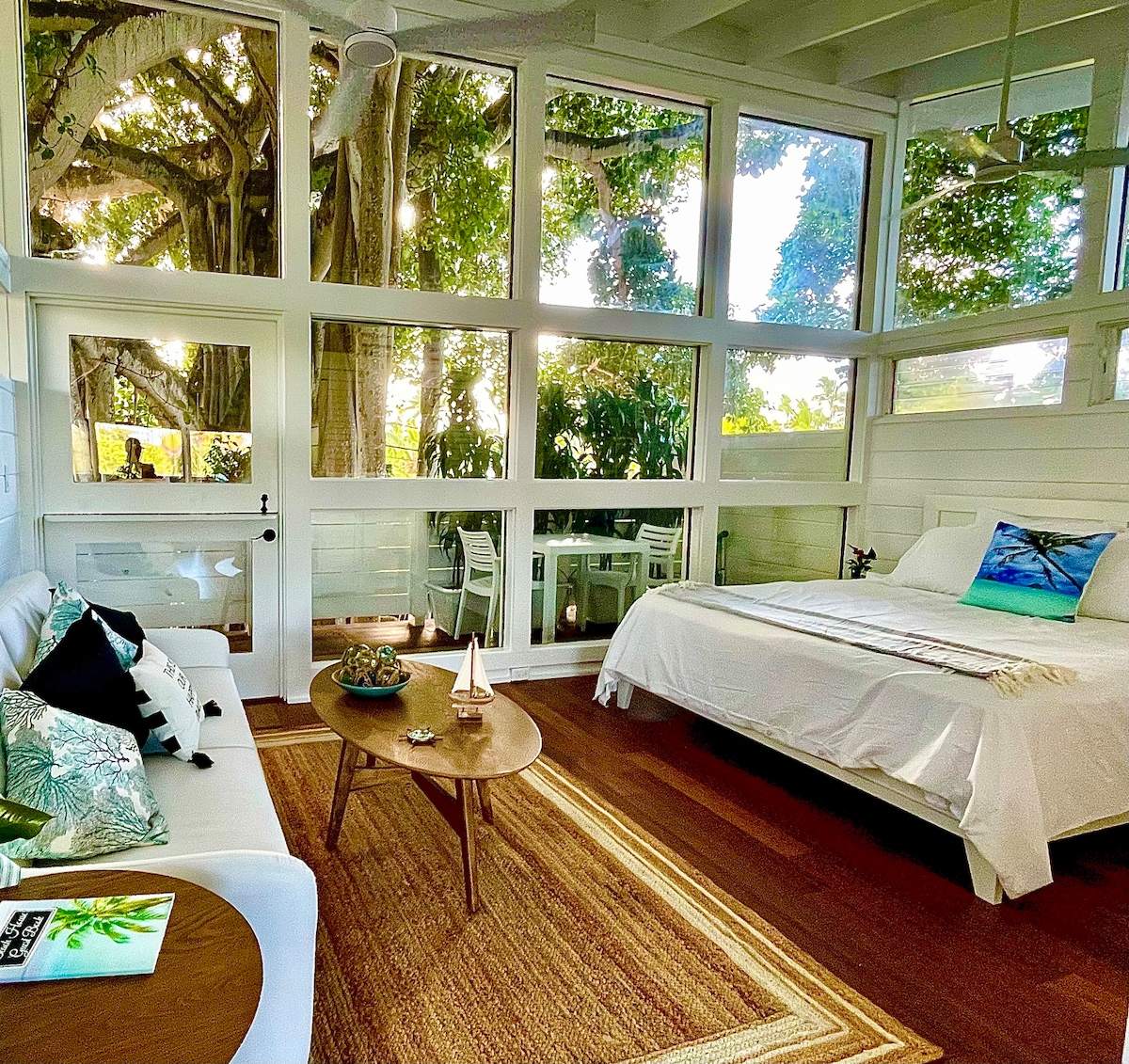 Hawaiian Island Beach Bungalows Kailua's Banyan Tree Bungalow is Magnificently Graceful in it's Design - Truly Island Elegance at it's best Floor to Ceiling Windows -this beautiful bungalow was built with thoughtful touches & amenities throughout. Located on a sandy beach path - steps to Kailua's crystal clear waters and powdery soft sandy beach. The Banyan bungalow is Private & Separate Quiet & Clean. Come relax in island paradise in this Beautiful Exquisitely & Elegantly Designed bungalow