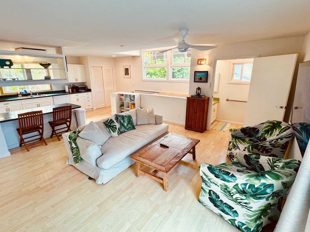 5- 10min drive to many restaurants and eateries. The unit has been newly remodeled and is on the base Ohana unit to the main home. Newer appliances, kitchen, bathroom, beds, sectional couch etc for your enjoyment.