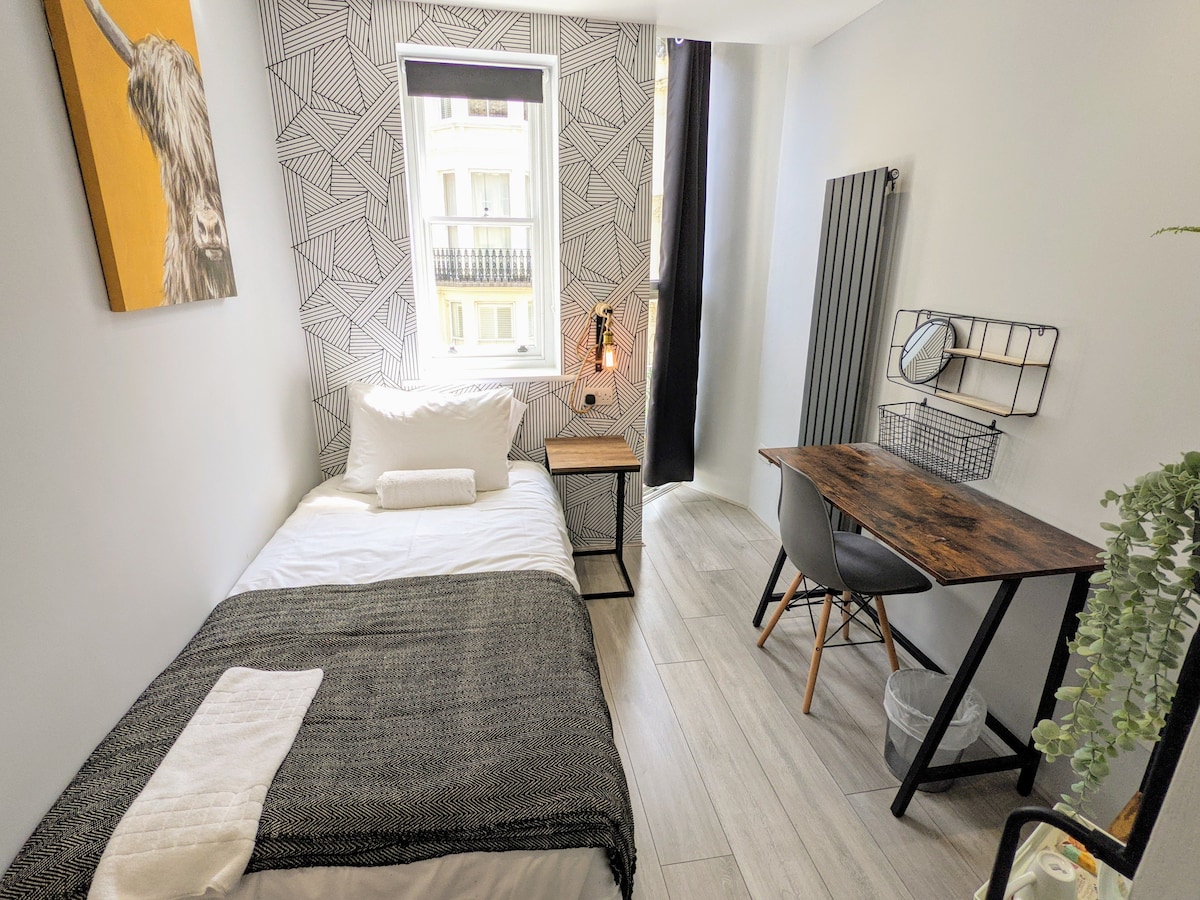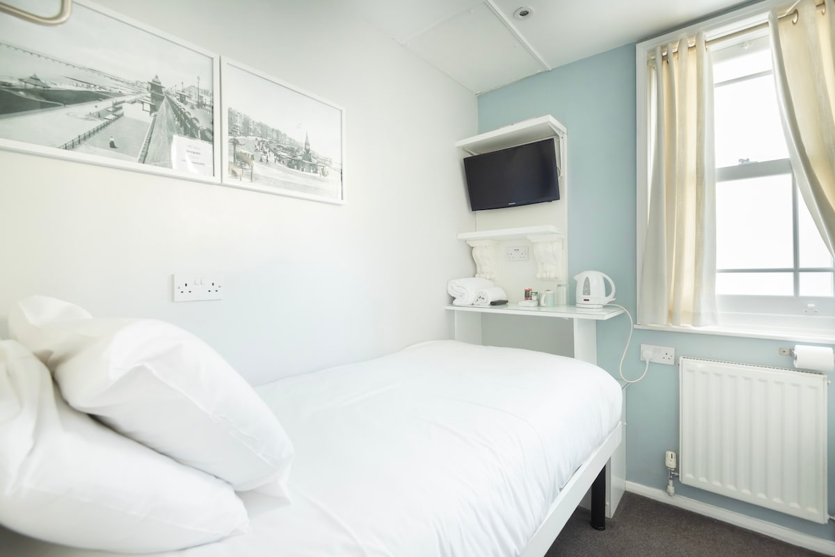 Step into classic British elegance in our Single Room at INNit Blue Sky Hotel, Kemptown. Featuring a spacious layout, plush single-size bed, and shower, with a toilet located at the common area, shared with another room. This room blends timeless style with comfort. Located just moments from Brighton’s beach, cafes, and vibrant nightlife—perfect for a charming seaside retreat in one of the city’s most iconic neighbourhoods.