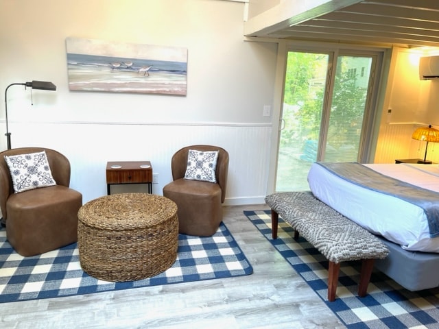 The Sandpiper Cottage is a detached cottage on inn's property with a queen bed, full bathroom, kitchen, sitting area, TV with cable, Wi-Fi, and a private patio area. It is pet-friendly and features a new mini-split. The kitchen has a refrigerator/freezer, range, microwave, toaster, Keurig machine, and kitchenware.
