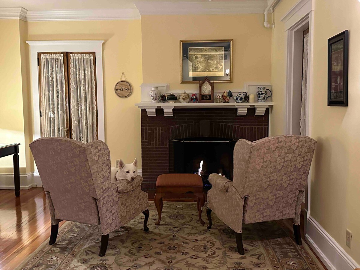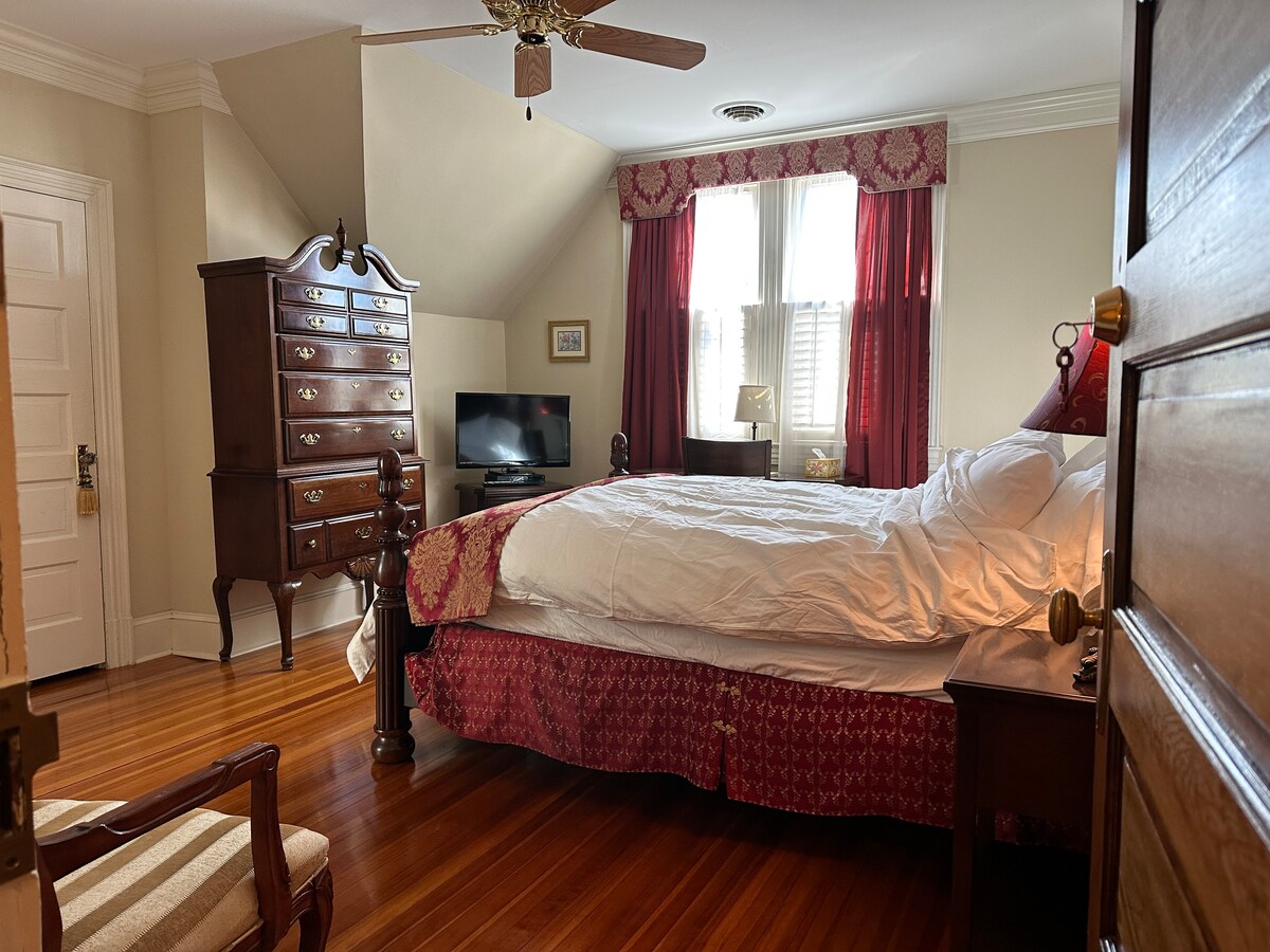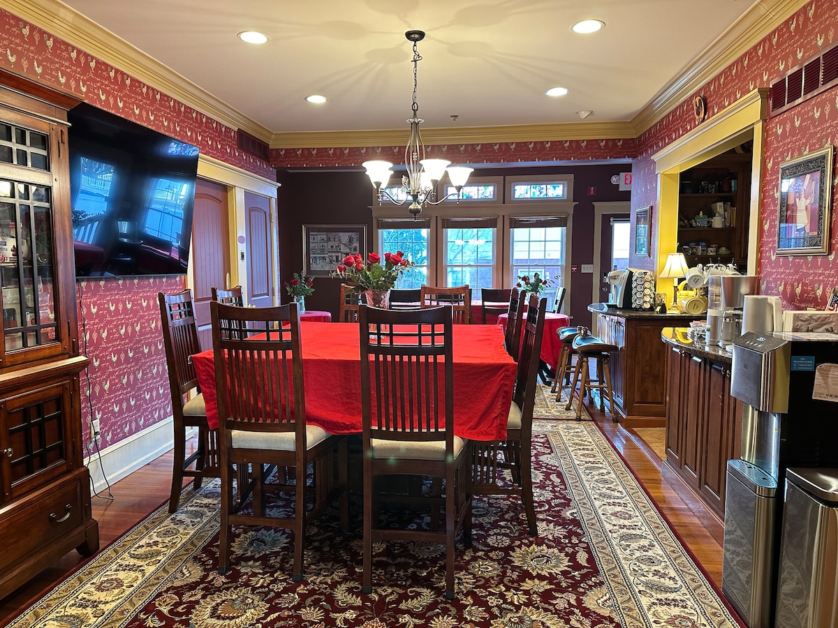 Red room of State Street Inn. Welcome to our inn! it’s a Tudor-style house located in historic downtown Dover, within walking distance to restaurants, museums, and historic sites.