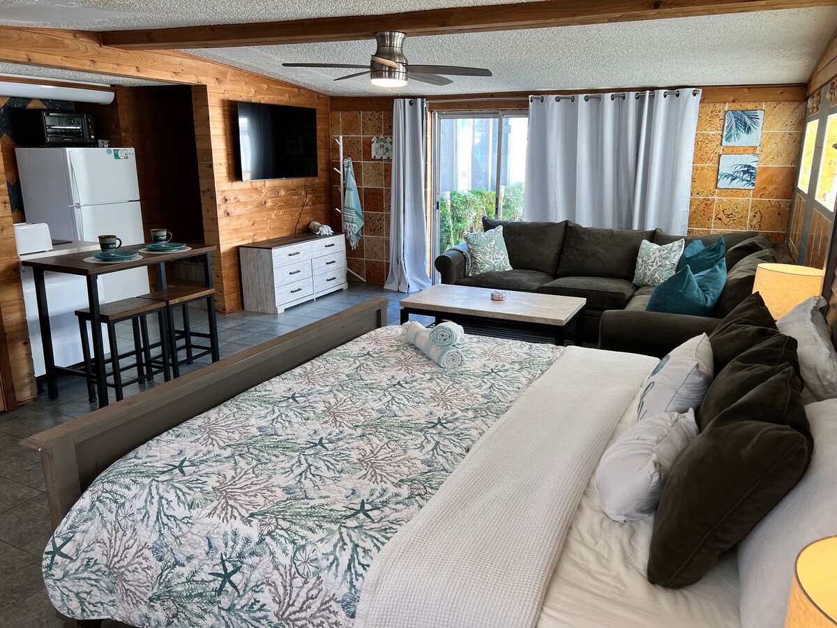 Welcome to The Salty Suite! Enjoy swaying palm trees, epic sunsets and a laid back, island vibe. In the studio, you'll be delighted to find unique touches like real seashells on the walls and fun & quirky decor in the kitchen. A large sectional and comfy king bed will give you comfort after a long day of beaching, fishing or snorkeling. The large sliding door offers plenty of light or, if you prefer, the blackout curtains can be closed to offer you privacy and tranquility.