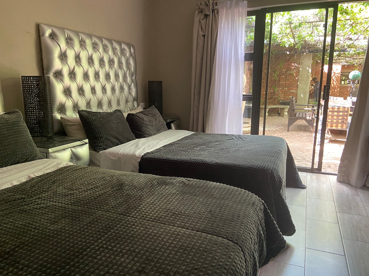 Two single beds. Spacious room with eclectic décor. Big suite with enough space to relax. Smart TV with Netflix & aircon makes this a superior unit. Room has 2 Single beds next to each other. Bathroom has bath/shower combination. Beautiful garden with braai facility. Private balcony overlooking the indoor pool.