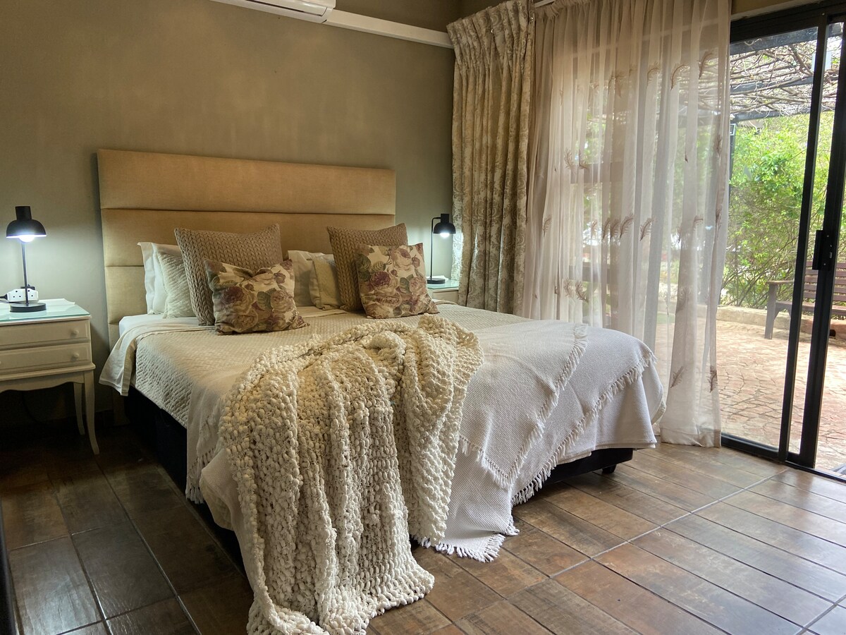 The De Lux Executive Suite has a King size bed and en-suite full bathroom. Equipped with microwave oven, fridge, desk, DStv, hair dryer and air conditioner, crockery, coffee and tea facilities. Ideal for honeymoon couples or business executives. Beautiful view to the garden. Private Entrance.