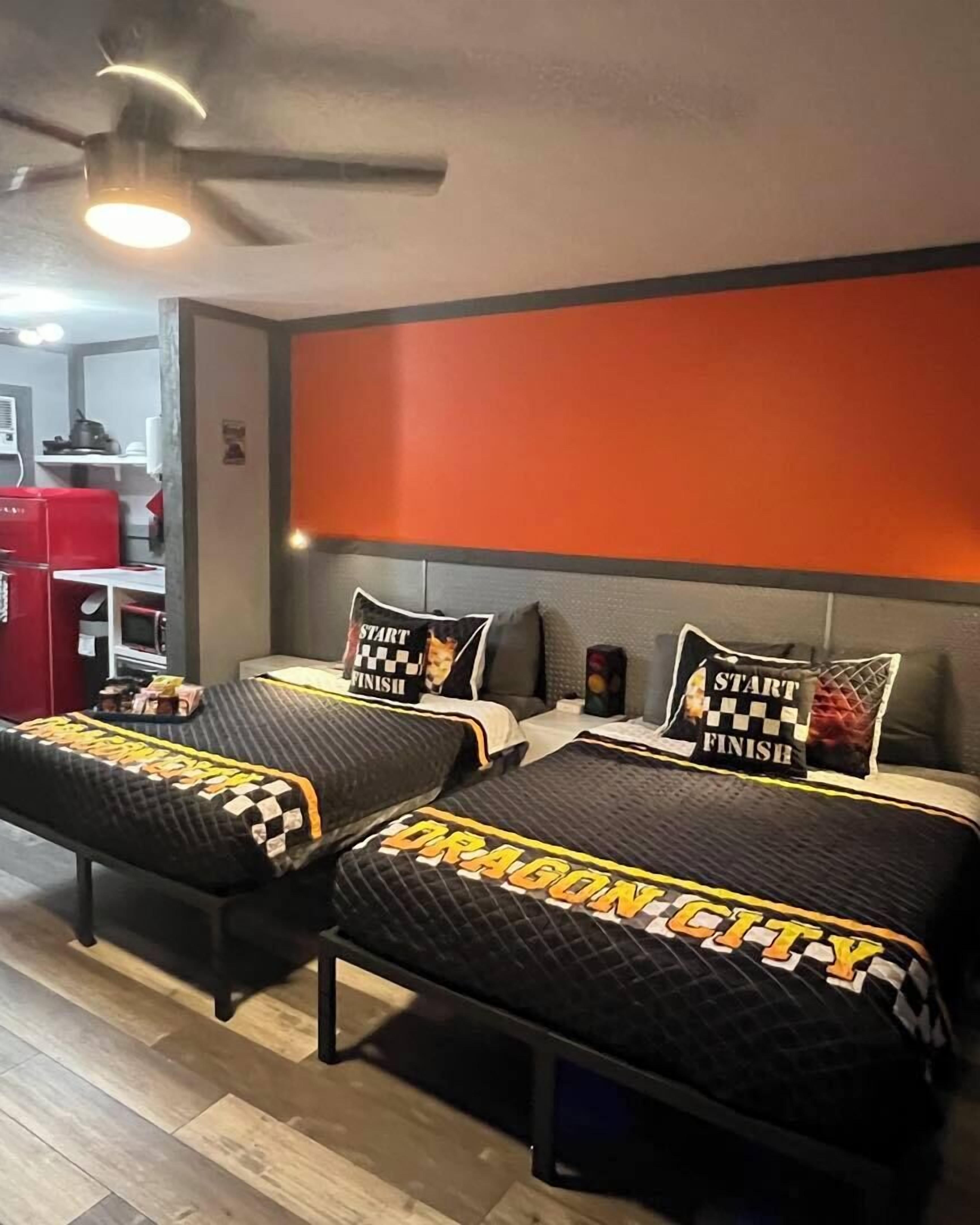 Horseshoe Turn is located on the 2nd floor and.. this room has 2 Full size beds as well as a sleeper sofa and also comes with complimentary WiFi and ESPN, Netflix, Amazon, Roku, Hulu, Disney+ streaming services and Cable. We are the only ones offering high speed FIBER internet
