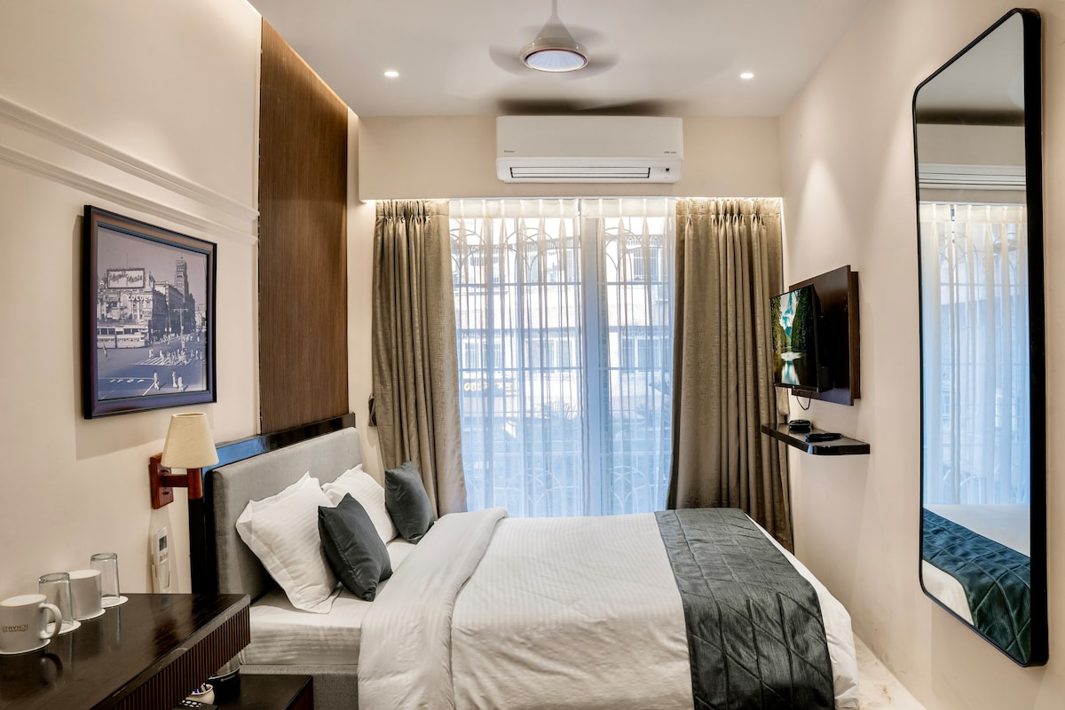 This room is a part of our guesthouse located in posh locality of Ballygunge, right next to Phari. The room comes with a big bed comfortable to accommodate 2/3 ppl. Room is equipped with ac, wifi and cupboard; has an attached bathroom with geyser, shower and fan. The place has a full time caretaker and cook. Fresh home cooked breakfast/ customised meals is available on small payment. Microwave and fridge available. Rooftop, living and dining accessible.Perfect place for short/long term stay.
