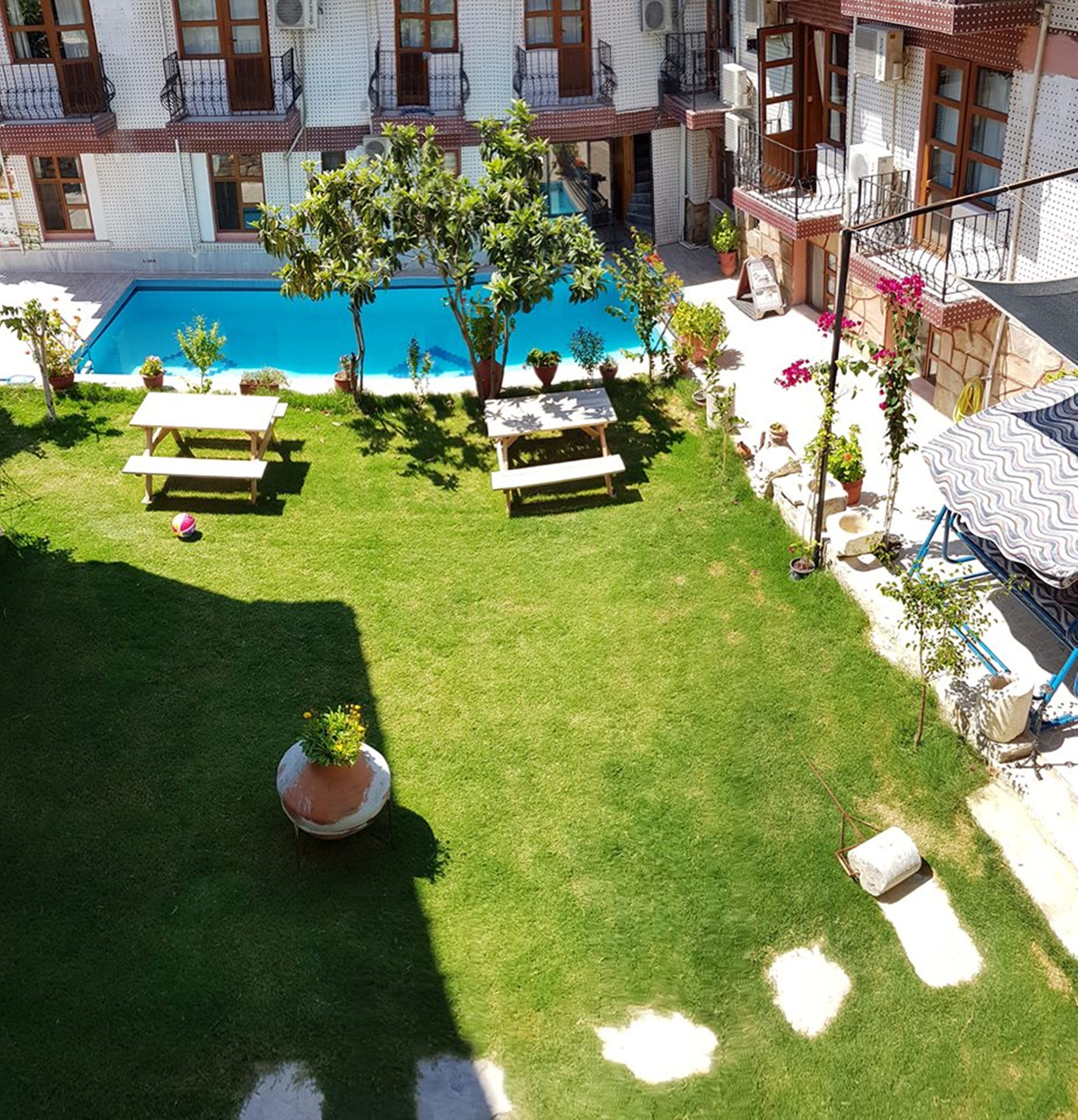 Our pension is 400 meters from Güzelçamlı Harbor and the small beach next to it. It gives the feeling of an oasis in the center of Güzelçamlı with its large garden with various fruit and large pine trees. You can enjoy the hammock under the sha