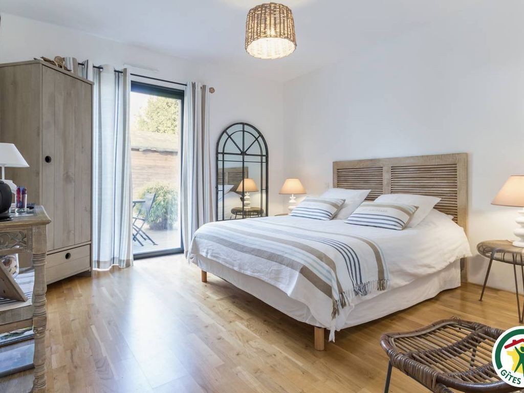 Celine and David welcome you in a magnificent contemporary architect villa of 2013. The Villa d'Escoublac will transport you in a calm and green environment with its heated swimming pool and its entirely landscaped garden where are mingled sublime independent wooden terraces and various exotic plantations.