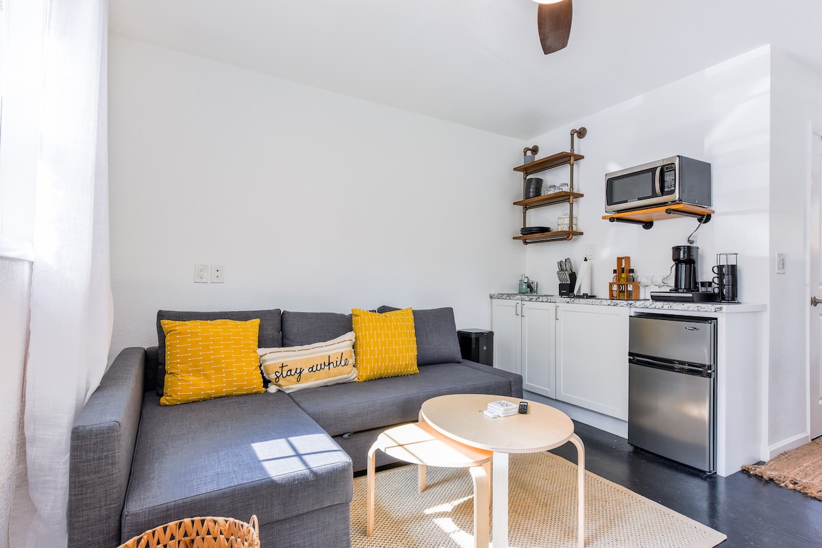 Open the sliding door in the kitchen/living room and step out onto the pool deck that surrounds the sparkling pool. This is where the space gets even more amazing. Two chaise lounges. Two adirondack chairs on the baja shelf. Two pub tables with four chairs a piece. Three umbrellas. A couch. Two fans. Two heaters (in case it's cold). A BBQ. A full-stocked mini-fridge. A 65" TV. Sonos music system.