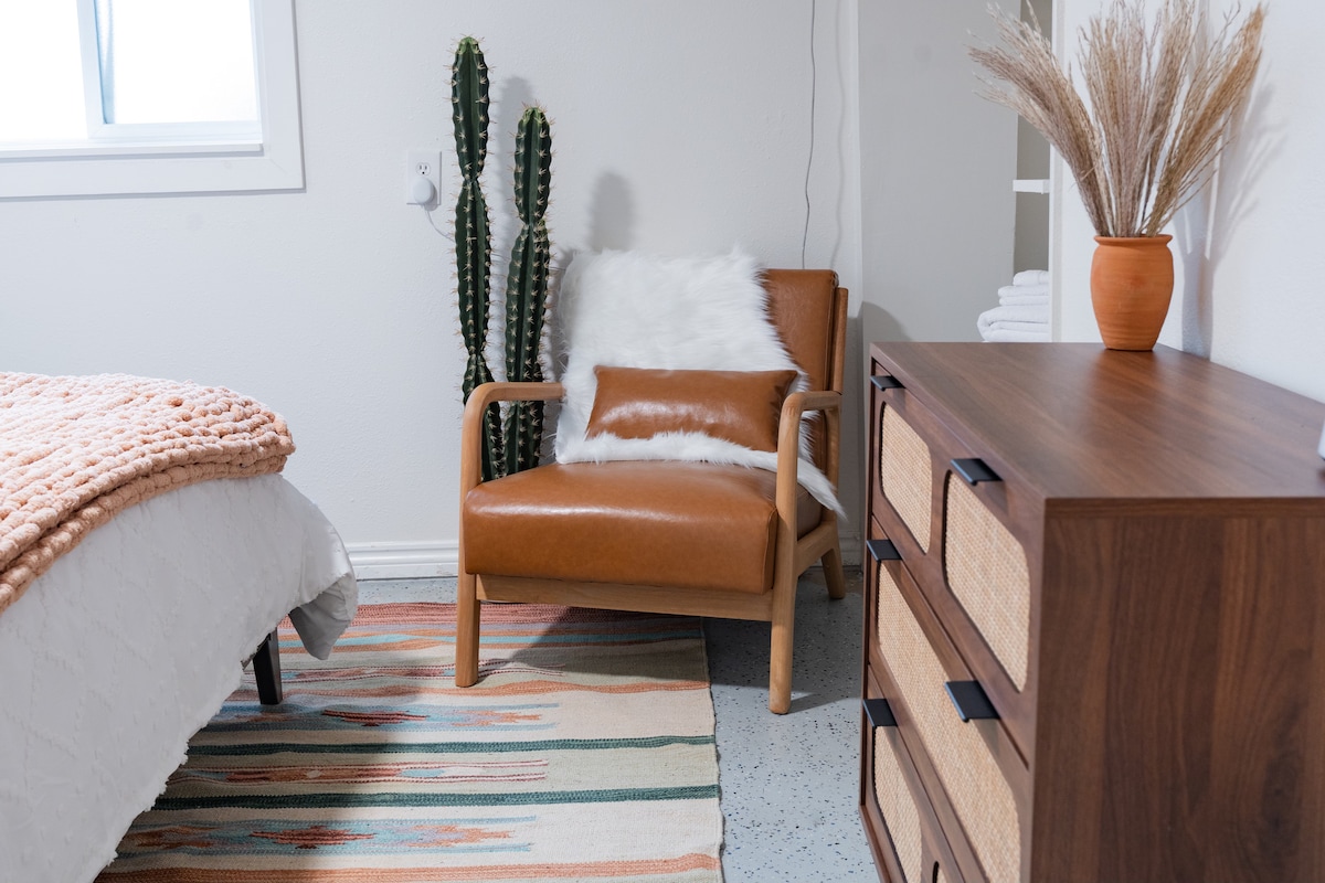 Private guesthouse. Sleeping area for MAX of 4 people. Very comfortable . Basic Toiletries are included. . The kitchenette includes pub table with 2 stools, Keurig Coffee pot (coffee pods), Toaster, Convection Oven, Stove top (2 burners), Microwave, and refrigerator freezer. This is a one bedroom with a queen size bed and dresser. The Livingroom has a Sofa Sleeper (pull-out queen-size bed with an upgraded memory foam mattress). Courtyard with outdoor furniture, a storage bench with blankets and bug spray, solar lighting. And just for fun, Bring a rock or paint one here to add to Roxy our rock snake 🐍