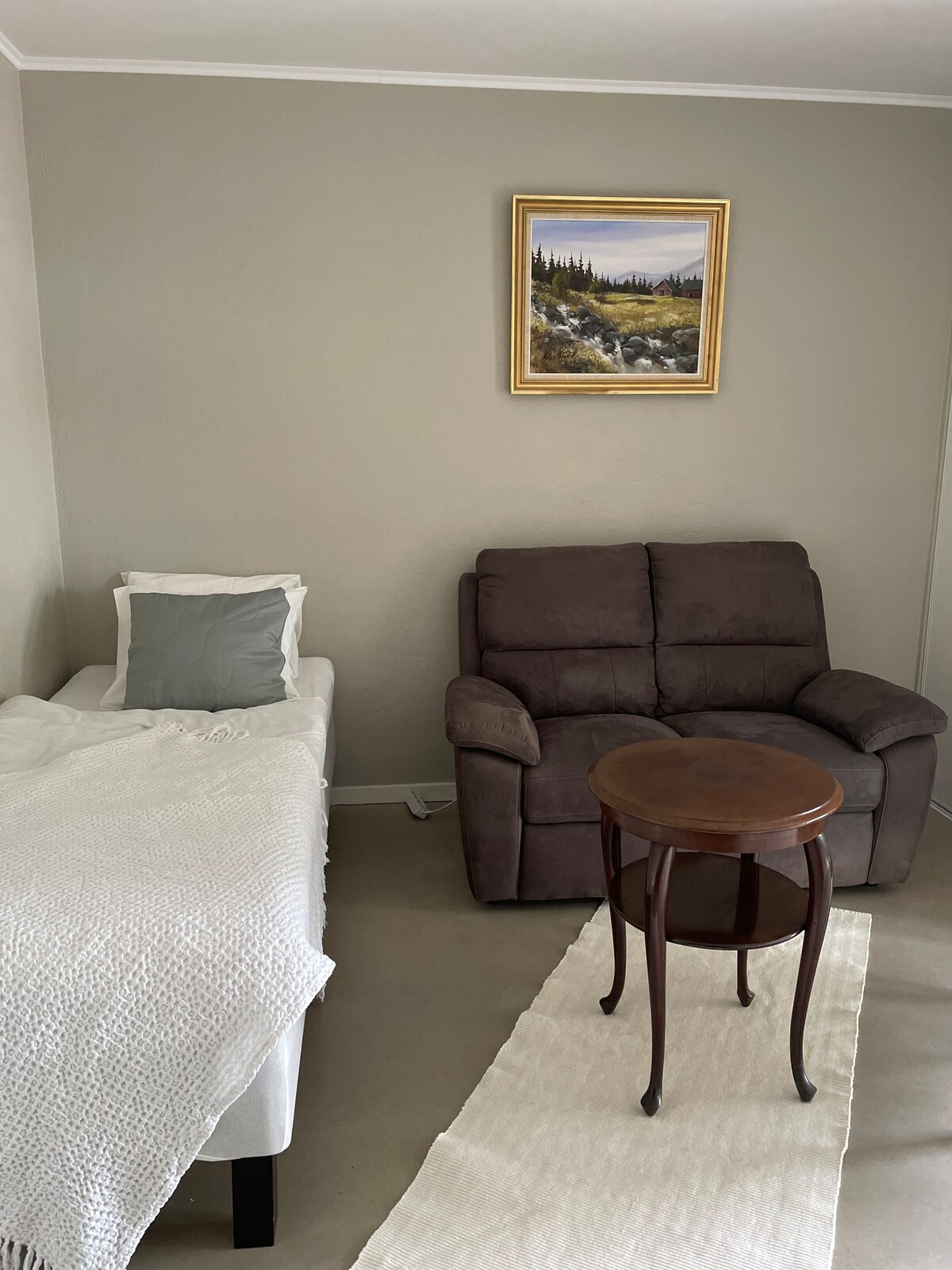 A room of 16 m2, a dresser, a wardrobe and one or two comfortable beds. Desk and office chair are available if required. A couch if required. Separate entrance from the common passage. View to the west from the window. A large shared kitchen where you have your own shelves in the cabinets and fridge. Nice shared patio with exit from the kitchen. Two bathrooms, usually one bathroom for two or three rooms. Laundry room/laundry corner with new modern appliances and an extra large sink.