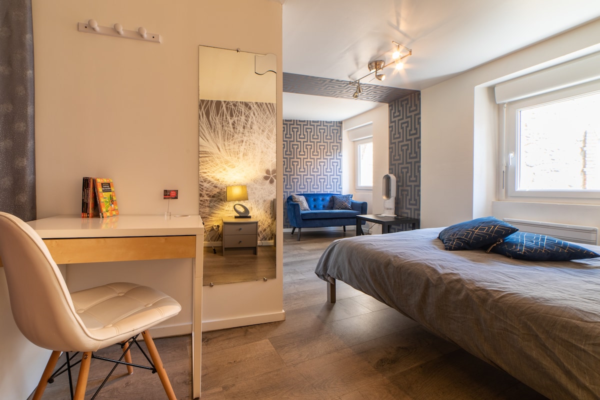 The studio (new) is equipped with a bed (140 x 200), a sofa convertible into a double bed (160 x 200) or two single beds (80 x 200), a folding extra bed (80 x 200), a refrigerator, an induction cooktop, a convection oven, a microwave, a 6-place dishwasher, a washing machine and a dryer, a 4k TV, (iron and ironing board, clothes rack on request).