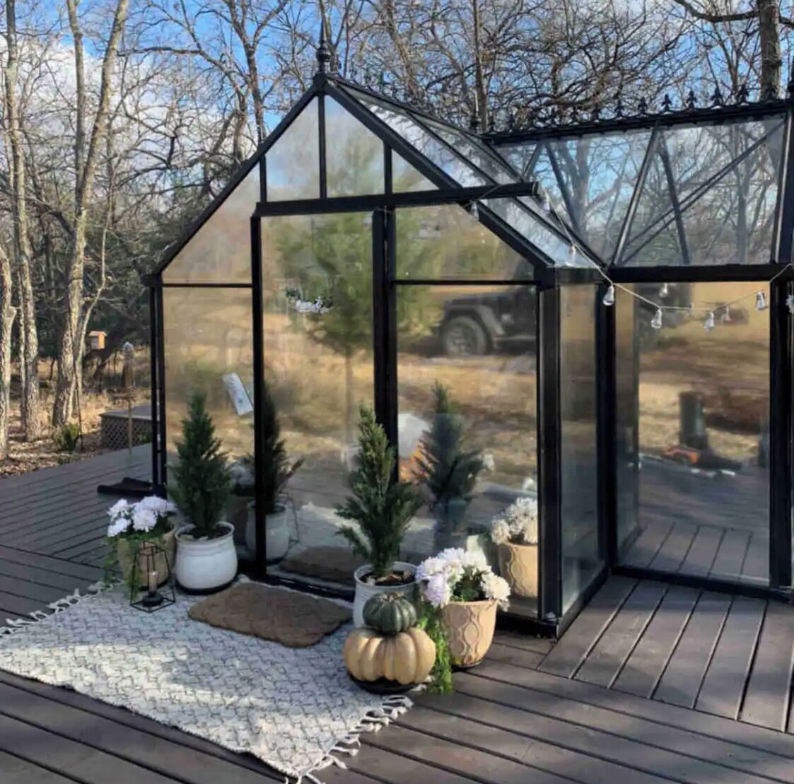 This off grid glamping location is surrounded by trees and prairie views. There is a rustic outdoor outhouse and a heater with electric blankets in the space.