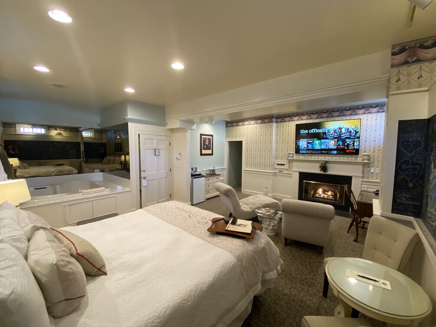 Our romantic "Firespa" suite with a Jacuzzi for two with a smokey mirrored surround, terry cloth robes and slippers, heated towel bar, period Inspired 1800's slate blackboards, king-sized bed; gas-operated fireplace; comfortable lounging chairs; a 70-inch wall mounted smart television with Blu-ray, DVD, Netflix, and HDMI port for your computer; in-room refrigerator; high speed wireless internet; Keurig coffee/tea ensemble; and setup for wine or champagne. Round out the romantic experience with a breakfast delivered to your door to share in bed. Amenities Keurig Coffee Maker Heated Towel Bar FREE High Speed Wireless USB Charging Station DVD Player Gas Fireplace Central Heat and A/C LCD TV w/ HDMI Refridgerator Single Person Whirlpool Tub Terry Robes and Slippers In-Room Massage Availible Telephone IPhone Dock Weighing Scale VCR Room Delivered Breakfast Availible Iron and Ironing Board Hair dryer Jacuzzi for Two Free Local And Long Distance Calls Bath and Bodyworks Toiletries Daily Local NewspaperWith French-inspired design and nine exceptional rooms, this nineteenth-century parochial school turned country inn possesses a unique character that celebrates it as a truly distinctive landmark in the beautiful Berkshire Hills. Located in the heart of Lee, Massachusetts, this unique historic hostelry has delighted guests since its opening in 1990. The Inn offers spacious 500-square foot suites which include elegant canopied beds, comfortable sitting areas with warming fireplaces to end a day on the slopes, private baths with soothing whirlpool tubs, a desk, phone, and cable television. Eight-foot windows and embossed thirteen-foot ceilings, designer fabrics, and the original blackboards contribute to the ambiance of this gracious Inn.