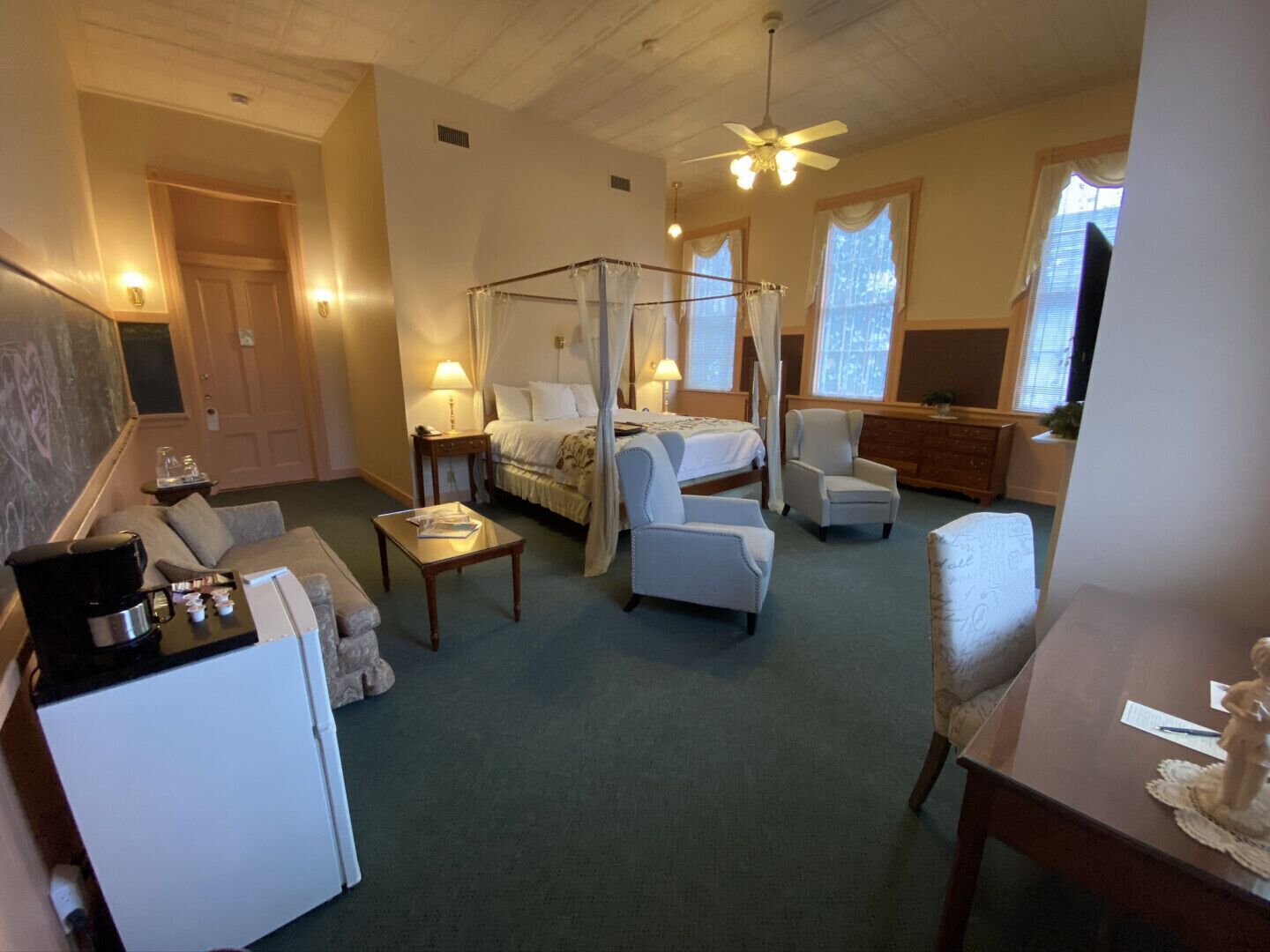 The exquisite Deluxe Schoolhouse Suite provides an impeccable setting for your holiday. Lounge next to the gas-operated fireplace or enjoy your room-delivered breakfast in its king-sized canopy bed with a Schiffman mattress. Its lovely period-inspired details combined with the 60-80 inch Smart television, Alexa Enabled Alarm Clock, telephone, high speed wireless, in-room refrigerator, Keurig coffee/tea ensemble, single whirlpool bath, heated towel bar, and terry cloth robes to give you the best of old and new.With French-inspired design and nine exceptional rooms, this nineteenth-century parochial school turned country inn possesses a unique character that celebrates it as a truly distinctive landmark in the beautiful Berkshire Hills. Located in the heart of Lee, Massachusetts, this unique historic hostelry has delighted guests since its opening in 1990. The Inn offers spacious 500-square foot suites which include elegant canopied beds, comfortable sitting areas with warming fireplaces to end a day on the slopes, private baths with soothing whirlpool tubs, a desk, phone, and cable television. Eight-foot windows and embossed thirteen-foot ceilings, designer fabrics, and the original blackboards contribute to the ambiance of this gracious Inn.