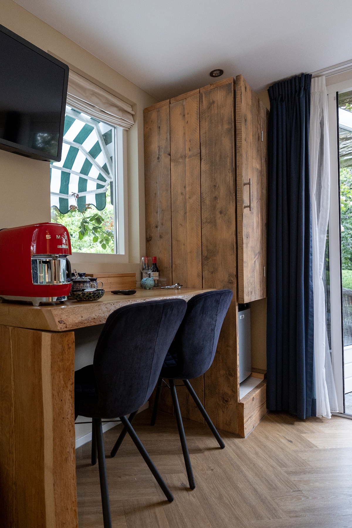 In the bedroom, there is a double box spring of 160x210cm, equipped with dimmable reading lamps. Next to the bedroom, there is an extra room with closets, a full-length mirror, a desk... so also suitable as a workplace.