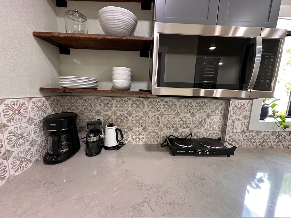 - Kitchenette: microwave, refrigerator, kettle, coffee pot, plates, bowls, cups, and dining area