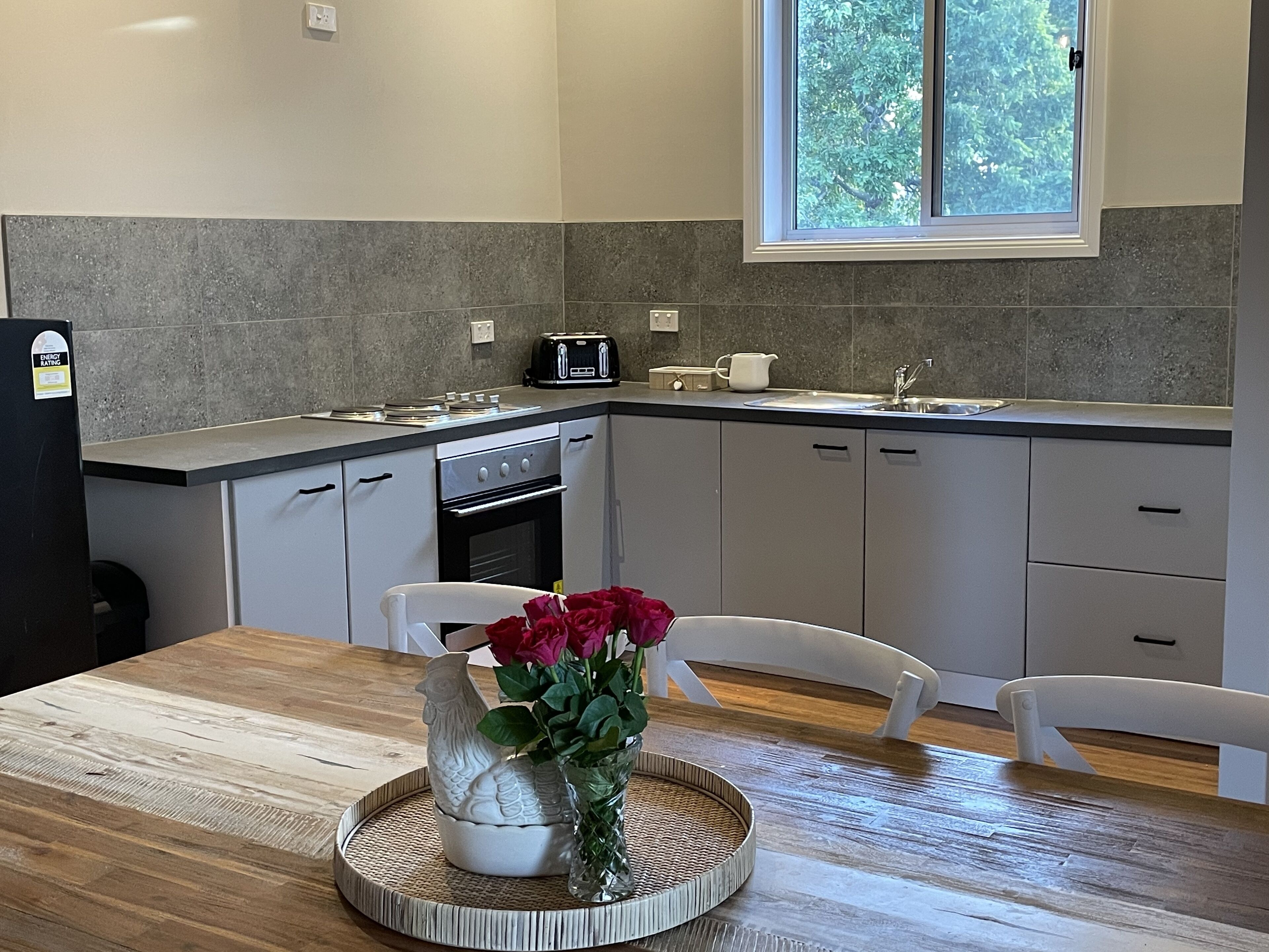 Guests booking the entire Main House enjoy all facilities except use of stove in the kitchen (accessed by staff). Guests have access to coffee and tea, a bar fridge, microwave and use of the BBQ facilities for sheltered cooking just outside the main house and outdoor meals if desired.
