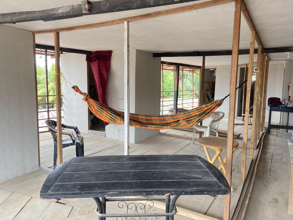 Entrance to the Tuki Tuki Iquitos Residence through the wooden door with a physical key, connected by a partition to the outdoor terrace, Hall, Living Room, Kitchen, Dining Room, Hammocks, toilet, space for washing and hanging clothes and an additional full bathroom.