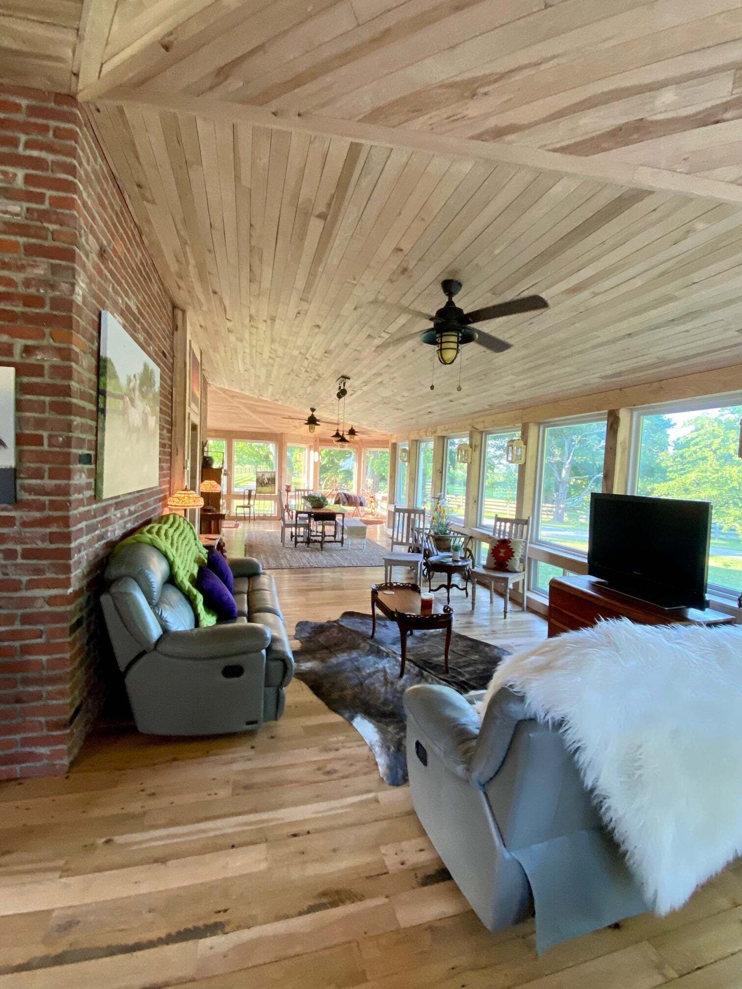 Gorgeous panoramic farm views from the nearly 1200 square feet of all glass porch. Recliners, sofas, chairs, game table, additional long table, private conversation nooks in over 3000 square feet! Zoned thermostats for each room/suite and wrap around. Clean, spacious horse-themed rooms with luxury sheets and cozy comforters. Extra blankets. Blankets and comforters washed and sanitized before each stay. 2 clean en-suite bathrooms, one shared bathroom. Four bedrooms, 3 full baths. Parlor with Grand Piano. Full dining room. Large Coffee/tea/beverage/snack bar with mini-fridge, microwave, Keurig and automatic electric tea kettle. Dishes, silverware, to-go cups. Secured, private entry. Wifi.