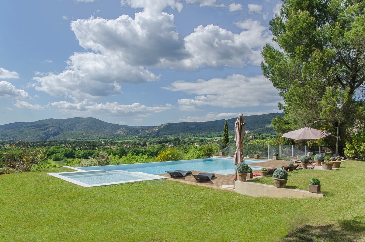 Located on a 1ha3 estate of holm oaks and century-old pine trees, you will be amazed by the panoramic view of the village of Lourmarin and its valley, the Luberon and the Alpillles.