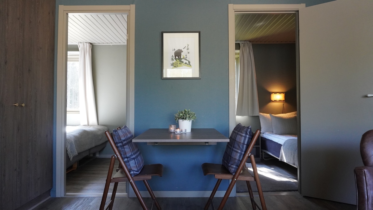 Accommodation is about 20 square meters with a kitchen and living room in one. Well-planned and fully equipped kitchen and a dining area that offers both morning and midnight sun (in the summer). Two comfortable armchairs and a bunk bed (120 and 90, respectively).