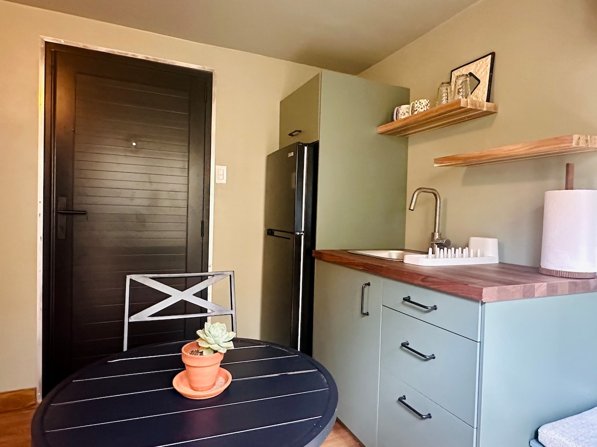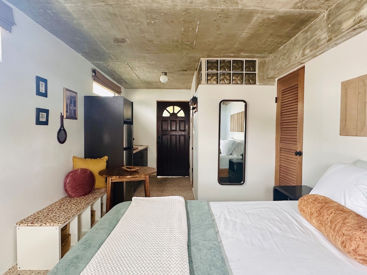 Nestled inside our lush Secret Garden and just steps from the beach, a cozy and private hideaway designed for solo travelers and couples. Features a queen bed, cold A/C, ensuite bathroom with hot shower, and a small private outdoor space with dining table, tropical plants, and an outdoor shower; perfect for rinsing off after the beach.