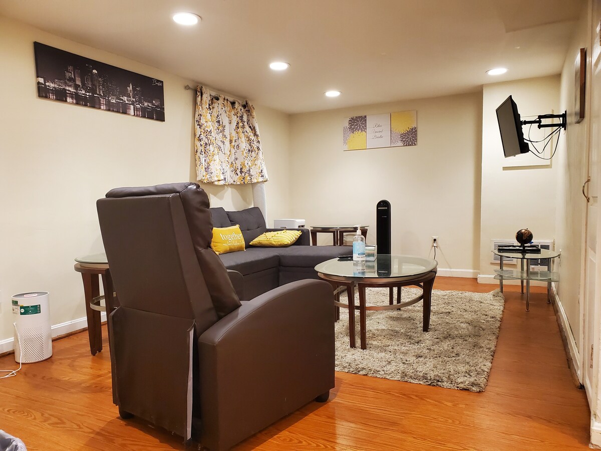 Enjoy the welcoming living room with a comfy futon for extra guests. This nice property offers amenities like WiFi, AC, and a hairdryer for your convenience. We look forward to hosting you at our place.