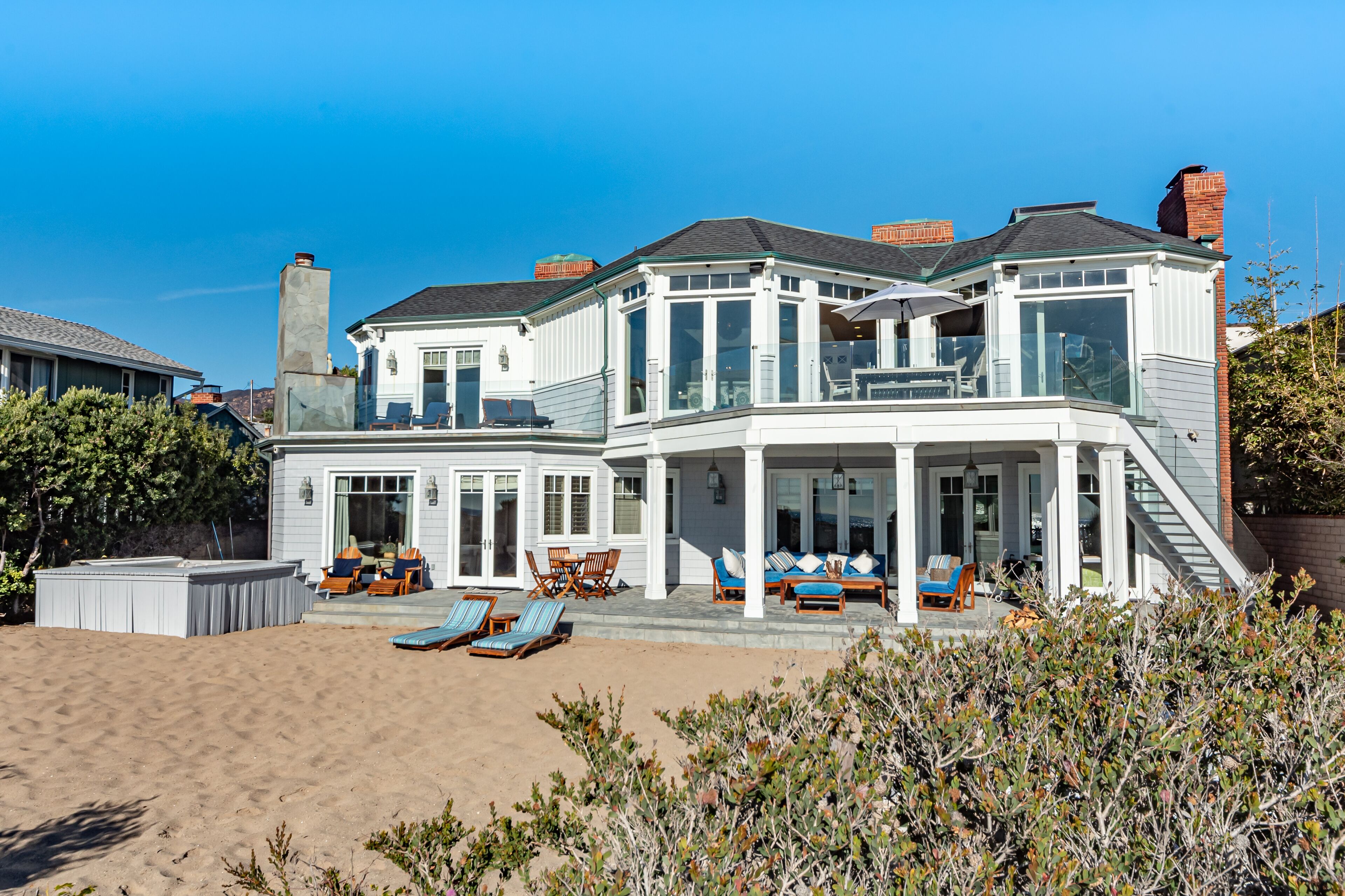 Beautiful, fully remodeled, Cape Cod Beach House, on exclusive Broad Beach. From every bedroom, you wake up and sleep to the sound of waves. This home is elegantly decorated, with open-beamed ceilings, lots of windows and natural light. It features 20 foot open beamed ceilings, and French doors leading out to the private patio on the beach and gardens in the back. Sleep to the peaceful sounds of the ocean in one of two spectacular master suites with a king size bed. Enjoy the outdoor fireplace on the private master deck. The master bathroom is finished with custom marble and tile and has a separate over size steam shower and deep soaking tub to relax in after a day at the beach. The first of three guest rooms features a king bed and French doors leading to the courtyard. A second guest room is perfect for children and has twin beds, with French doors leading out to a patio on the beach. The house rents from $4000 - $6000 per night depending upon time of year, length of stay and number of guests.