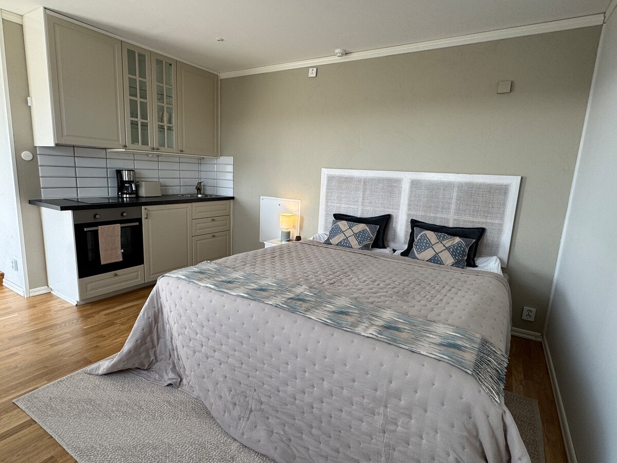 Number of bedrooms 1 (Double bed that can be pulled apart into two 90 cm beds). There is also a dresser and two stools in the room.