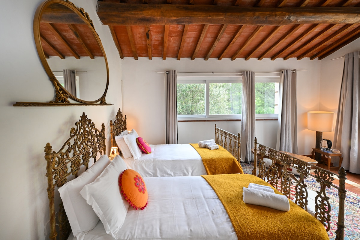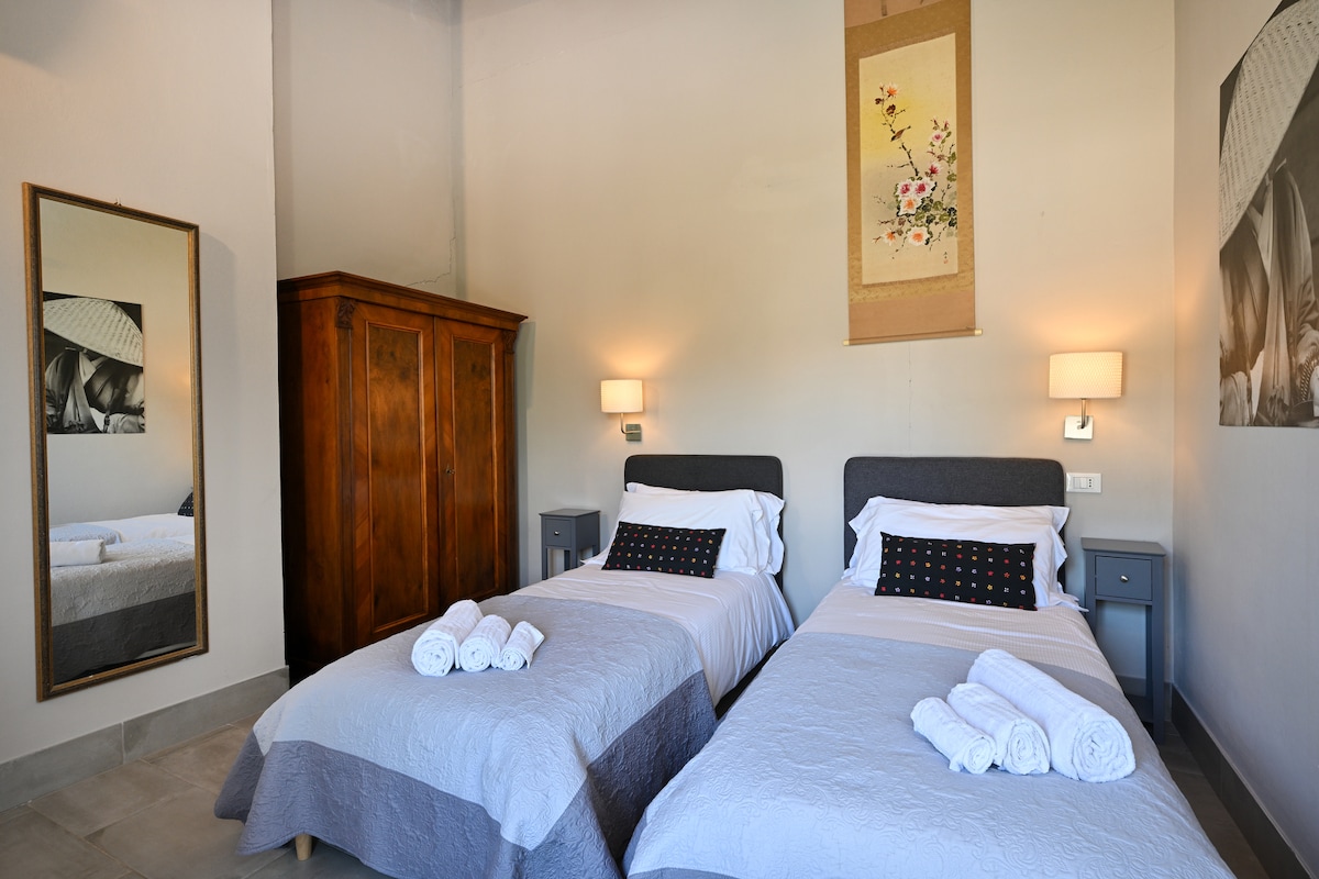 Inside the La Grande Via property, on the rolling hills of the Maremma, between Saturnia and Montemerano, this large double bedroom on the first floor, with two separate single beds, offers panoramic windows overlooking the stone rooftops and the garden below, enveloped in light and silence. Hot/cold air conditioning and minibar guarantee comfort. A few steps away, a panoramic swimming pool for rejuvenating dives. Upon awakening, vegetarian breakfast included; dinner on request and for a fee.