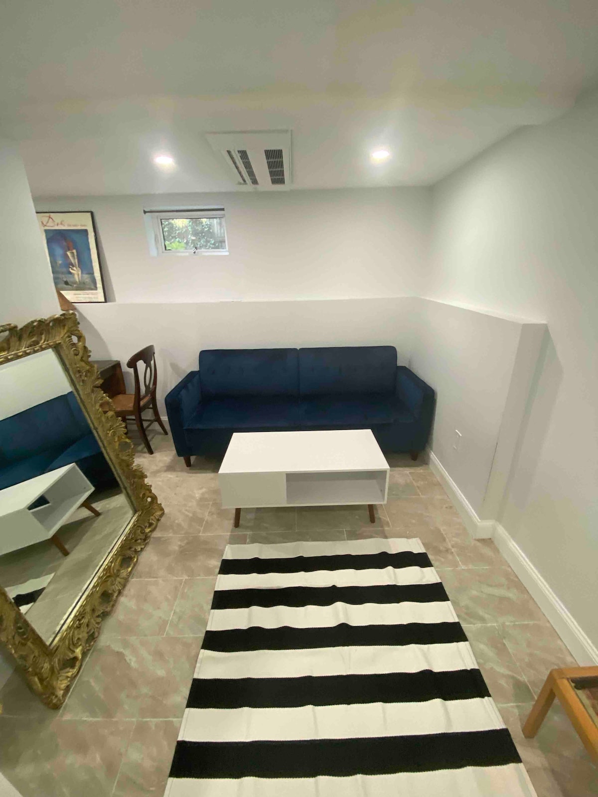 Entire through the side door by the parking area and use the passcode to unlock the door. You'll have the entire lower-level space to yourself, including one bedroom, a living room, and a private bathroom.
