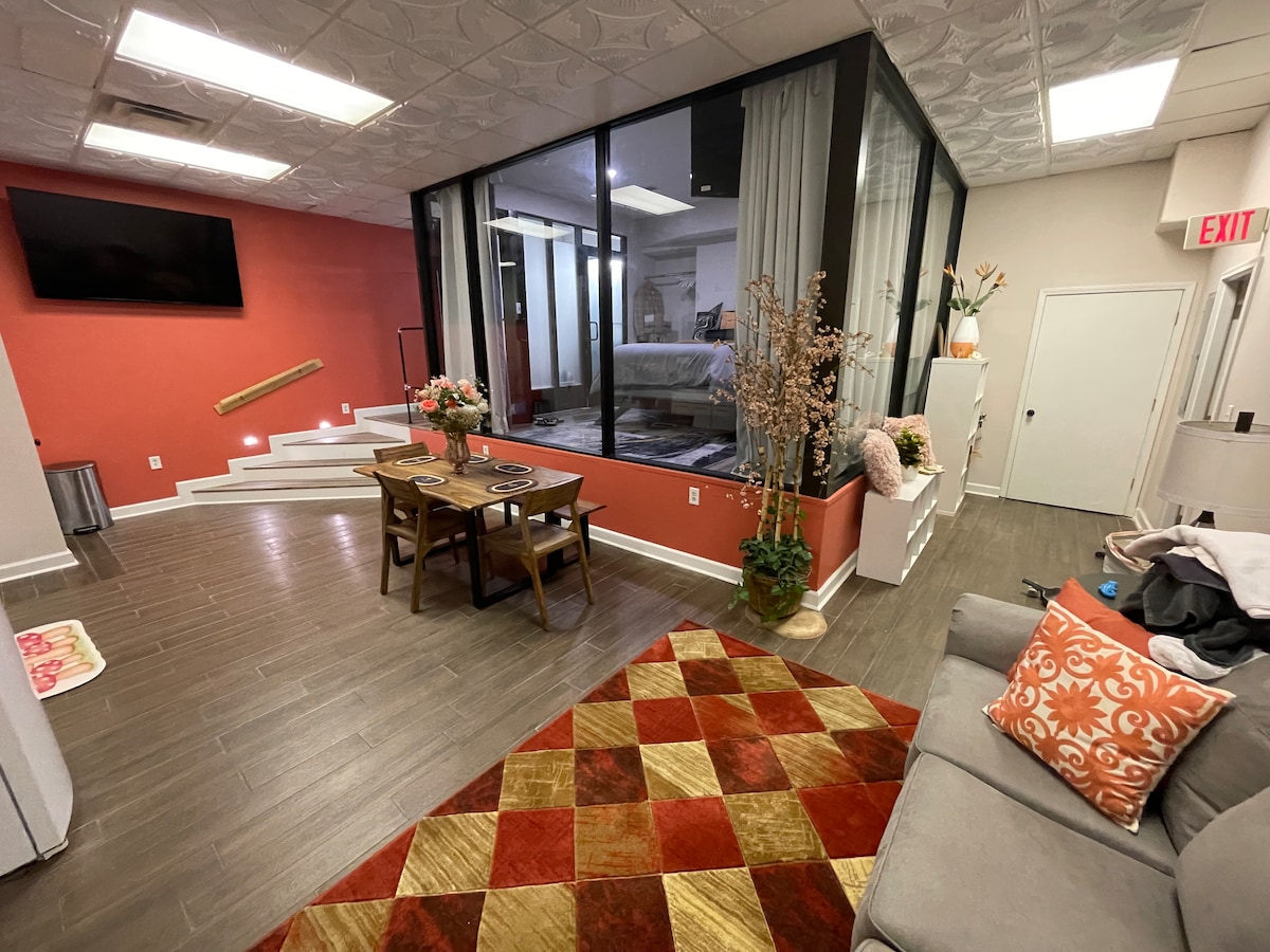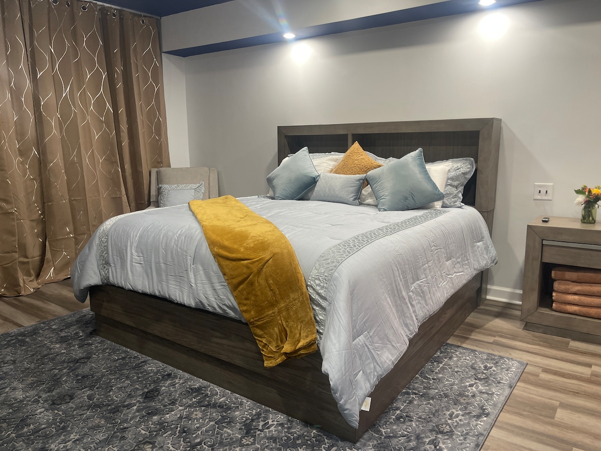 The large shower and soaking tub are ideal for winding down. The flat screen TV rotates so you can watch from the couch, bed, or even kitchen. Kitchen comes with all the essentials. In short, the place has all the amenities for a great stay--long or short term.