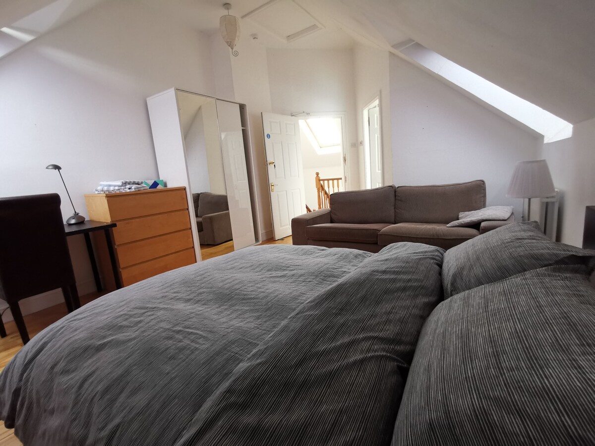 Self contained, brand new stunning studio is situated in a quiet cul-de-sac surrounded by greenery. Private entrance with own key, King Size bed, tempur mattress,en-suite with s power shower, kitchenette with fridge, Smart TV with Netflix and Amazon.
