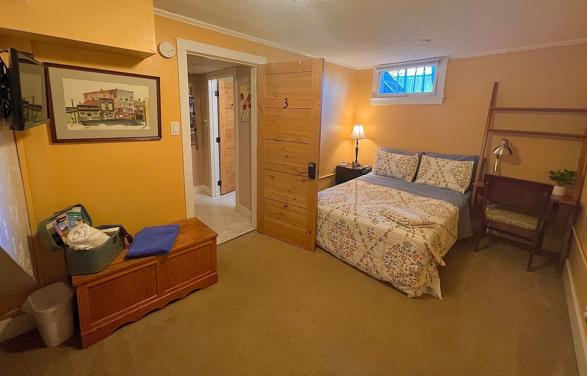 Indulge in the charm of the City Room at the Gibson Mansion. Impeccably preserved, this historic property built in 1903 offers a unique blend of old-world allure and modern comfort. Relax in a comfortable queen-sized bed surrounded by elegant furnishings. The room features a spacious desk for work or reflection. Immerse yourself in the ambiance of this historic gem, where timeless elegance meets contemporary convenience