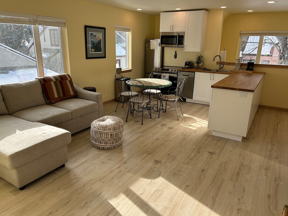 Williamsburg, Missoula is an open, airy loft space above a detached garage with a private entrance, bathroom, washer and dryer, radiant floor heating, TV, wifi, and a full kitchen with full sized appliances . Multiple skylights create a warm space for both work and relaxation.
