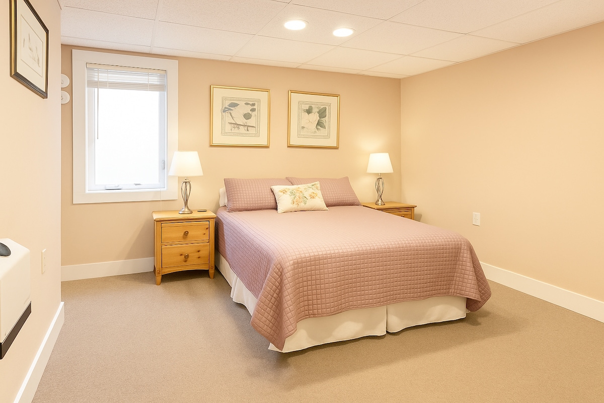 Off Street private parking directly across from campus simply walk into the stadium from here each Guest room comes with a swag bag with snacks treats and libations To Get The Party Started! Experience serene Montana vibes in this spacious bedroom. The room features two large 44-inch double-hung windows that flood the space with natural light & delightful garden view. Modern amenities include a wall-mounted smart TV & a standard closet with a full-length mirror.