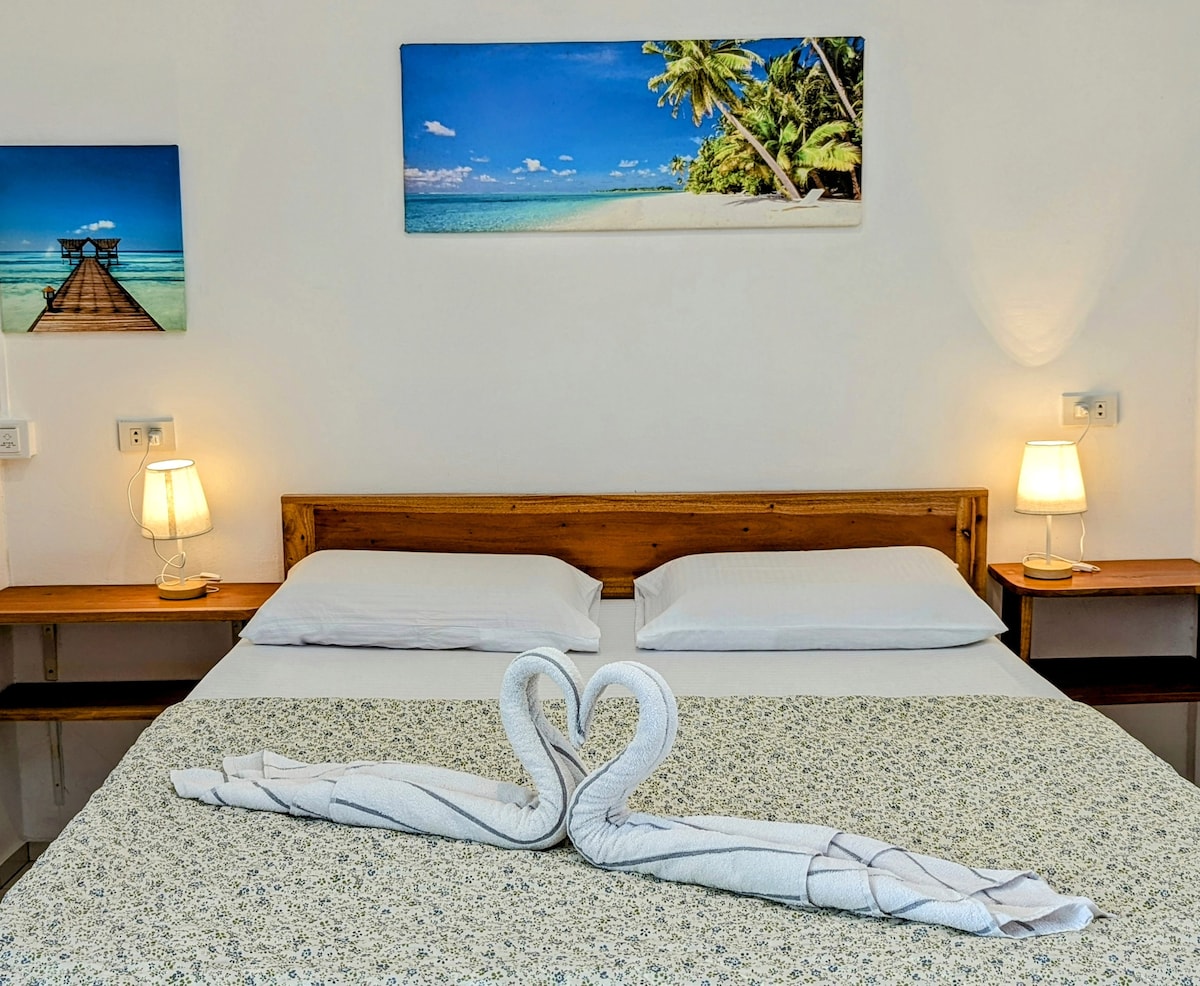 This double room features a low noisy aircon (split) , a private toilet, hot shower, fridge, an electric kettle and a sideboard for preparing light meals.